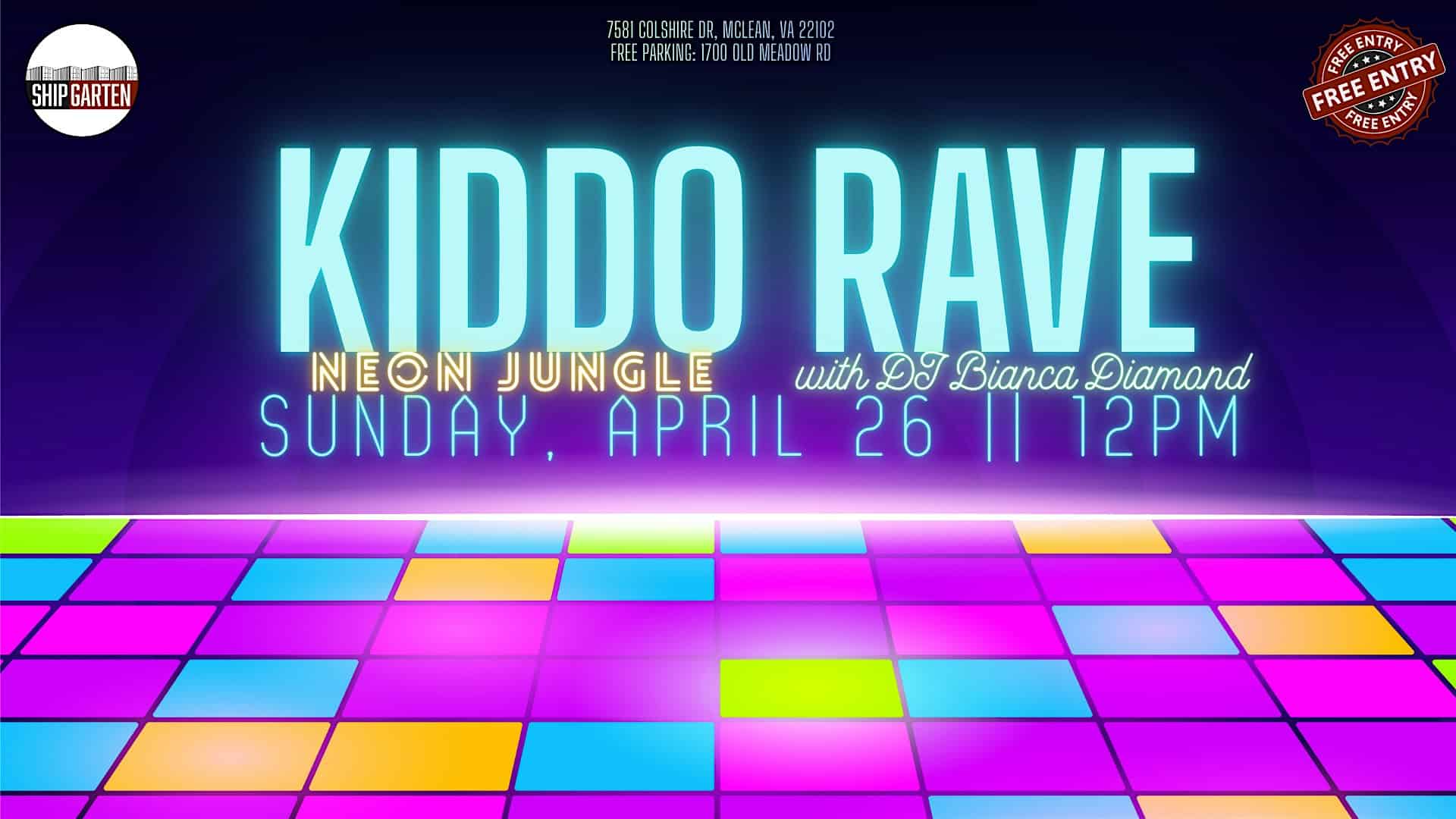 by admin14Feb Kiddo Rave at 7581 Colshire Dr – Tysons, VA Kiddo Rave at 7581 Colshire Dr – Tysons, VA 1 1 people viewed this event. Get ready to bring your little ones to a wild dance party with Kiddo Rave, where the kids will groove to their favorite tunes! Tickets-RSVP Link Date And Time Sunday, April 26th, 2026 04:00 PM (PST) Venue 7581 Colshire Dr Location 7581 Colshire Drive, Tysons, VA 22102 Event Types Party or Social Gathering Event Category Virginia Share With Friends Facebook Twitter Linkedin Xing Pinterest Share This Post: