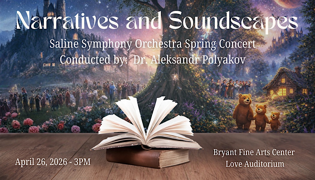 Saline Symphony Orchestra: Narratives and Soundscapes at 500698 Harris St – Bryant, AR Saline Symphony Orchestra: Narratives and Soundscapes at 500698 Harris St – Bryant, AR 3 3 people viewed this event. The Saline Symphony Orchestra, conducted by Dr. Alex Polyakov, invites you to a spring Sunday afternoon of music that tells a story. Tickets-RSVP Link Register for event Date And Time Sunday, April 26th, 2026 @ 03:00 PM Location 500698 Harris Street, Bryant, AR 72022 Event Types Concert or PerformancePerforming & Visual Arts Event Category Arkansas Share With Friends Facebook Twitter Linkedin Xing Pinterest