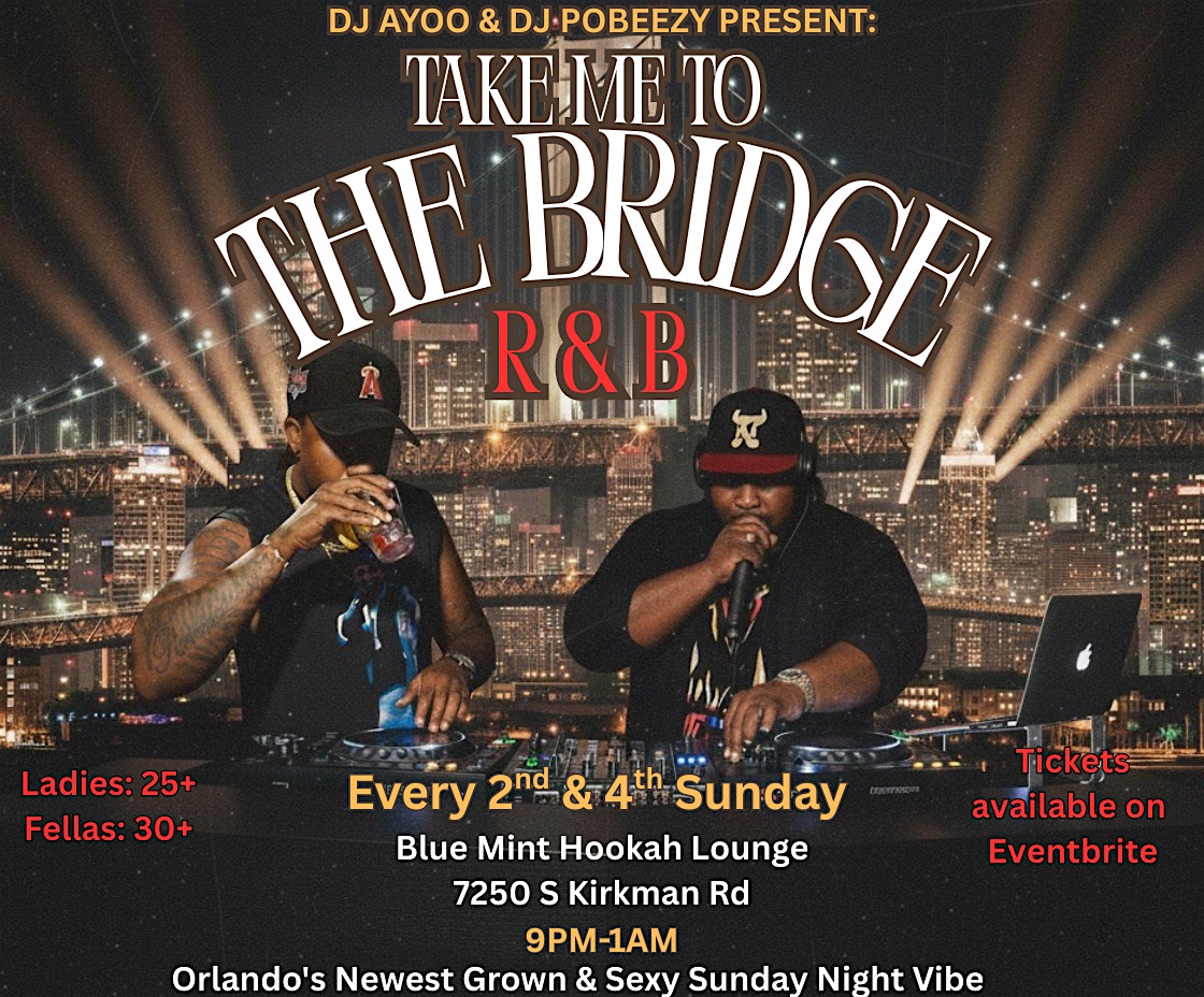 Take Me to the Bridge at Blue Mint Premium Hookah Lounge and Bar – Orlando, FL Take Me to the Bridge at Blue Mint Premium Hookah Lounge and Bar – Orlando, FL 5 5 people viewed this event. A night of R&B, Oldies but Goodies, and Classic hits for the Grown and sexy. This party is 25+ for women and 30+ for men. Tickets-RSVP Link Register for event Date And Time Sunday, April 26th, 2026 @ 09:00 PM Location Blue Mint Premium Hookah Lounge and Bar 7250 South Kirkman Road, Orlando, FL 32819 Event Types Concert or PerformanceMusic Event Category FloridaOrlando Share With Friends Facebook Twitter Linkedin Xing Pinterest