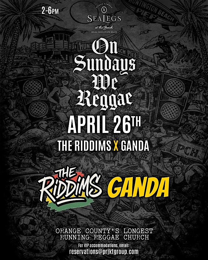 by admin27Feb The Riddims X Ganda at SeaLegs at the Beach – Huntington Beach, CA The Riddims X Ganda at SeaLegs at the Beach – Huntington Beach, CA 2 2 people viewed this event. Come see The Riddims X Ganda at 2pm on April 26th at Sealegs. All ages welcome. For VIP reservations email reservations@prjktgroup.com Tickets-RSVP Link Date And Time Sunday, April 26th, 2026 @ 02:00 PM Location 17851 Pacific Coast Highway, Huntington Beach, CA 92649 Event Types Concert or PerformanceMusic Event Category CaliforniaIrvine Share With Friends Facebook Twitter Linkedin Xing Pinterest Share This Post: