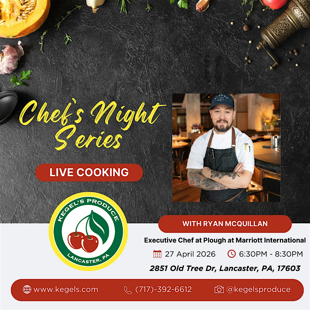 by admin24Feb Chef’s Night Series at Kegel’s Produce – Lancaster, PA Chef’s Night Series at Kegel’s Produce – Lancaster, PA 2 2 people viewed this event. Take the night off from cooking and join us for a live cooking demo with a local chef in our Produce Playground for fresh flavors and fun! Tickets-RSVP Link Date And Time Monday, April 27th, 2026 06:00 PM (PST) Venue Kegel's Produce Location 2851 Old Tree Drive, Lancaster, PA 17603 Event Types Food & Drink Event Category Pennsylvania Share With Friends Facebook Twitter Linkedin Xing Pinterest Share This Post: