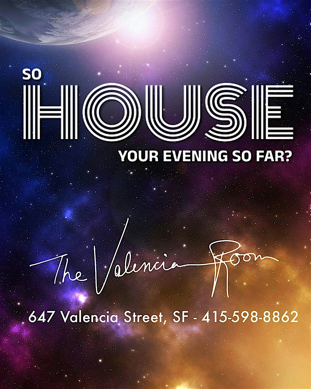 So HOUSE Your Evening So Far? at The Valencia Room – SAN FRANCISCO, CA So HOUSE Your Evening So Far? at The Valencia Room – SAN FRANCISCO, CA 5 5 people viewed this event. House Music Every Monday – Community, Dancing, Connections & Fun. Tickets-RSVP Link Register for event Date And Time Monday, April 27th, 2026 @ 10:00 PM Location The Valencia Room 647 Valencia Street, SAN FRANCISCO, CA 94110 Event Types MusicParty or Social Gathering Event Category CaliforniaSan Francisco Share With Friends Facebook Twitter Linkedin Xing Pinterest