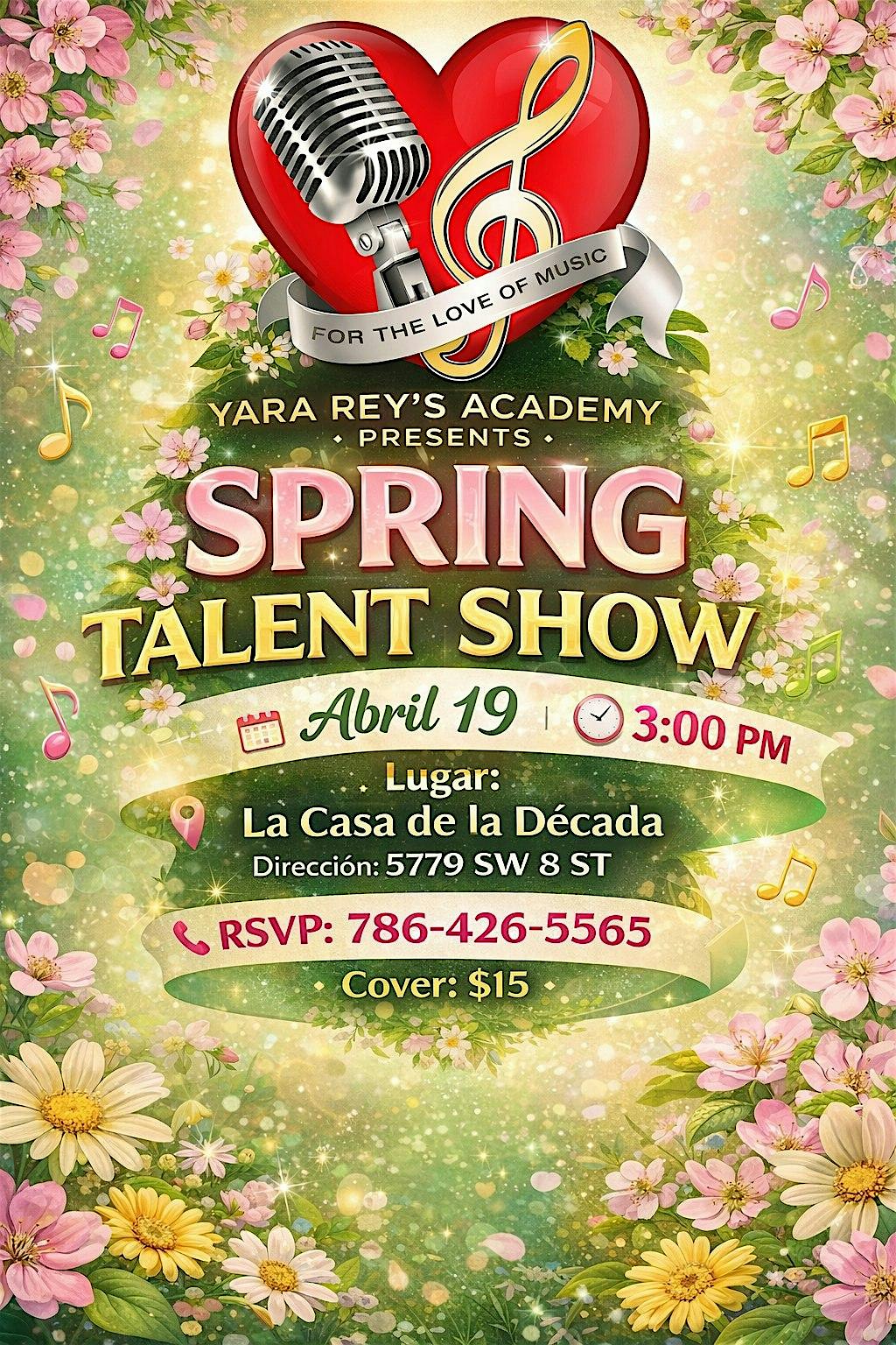 Spring talent show at La Casa de La Decada Restaurante – Miami, FL Spring talent show at La Casa de La Decada Restaurante – Miami, FL 1 1 people viewed this event. Talented students from Yara Rey’s Academy will lend their voices to an unforgettable show. Tickets-RSVP Link Register for event Date And Time Monday, April 27th, 2026 @ 03:00 PM Location 5779 Southwest 8th Street, Miami, FL 33144 Event Types Concert or PerformanceOtherPerforming & Visual Arts Event Category FloridaMiami Share With Friends Facebook Twitter Linkedin Xing Pinterest