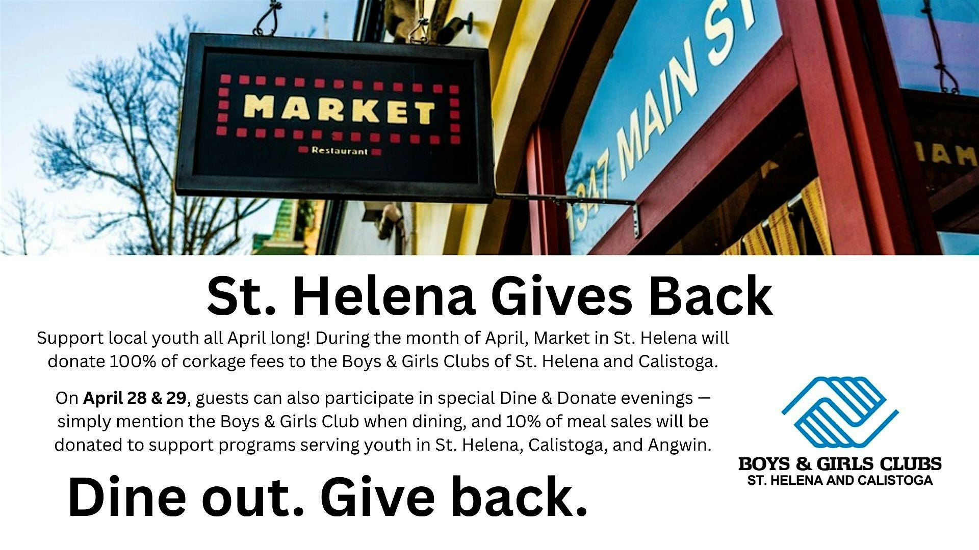 Dine & Donate: Market at Market – St. Helena, CA Dine & Donate: Market at Market – St. Helena, CA 3 3 people viewed this event. On April 28 & 29 simply mention the Boys & Girls Club when dining, and 10% of meal sales will be donated to BGCSHC Tickets-RSVP Link Register for event Date And Time Tuesday, April 28th, 2026 @ 12:00 PM Location Market 1347 Main Street, St. Helena, CA 94574 Event Types Food & DrinkOther Event Category California Share With Friends Facebook Twitter Linkedin Xing Pinterest