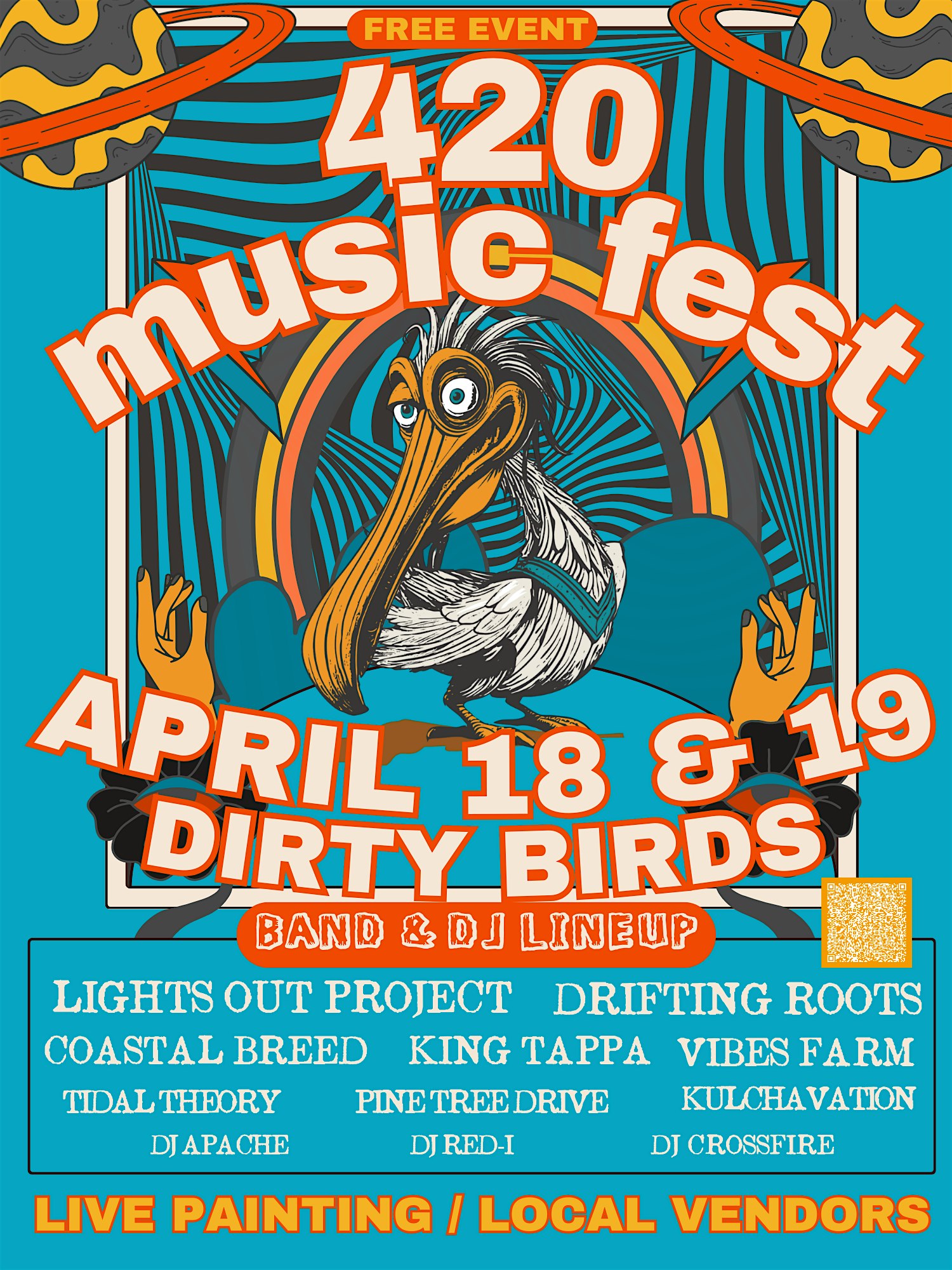 We’re turning Dirty Birds into a 420 Fest takeover featuring live bands, DJs, local vendors, and artists painting on site all weekend long.Come hang, grab a drink, shop local, and vibe out with us!