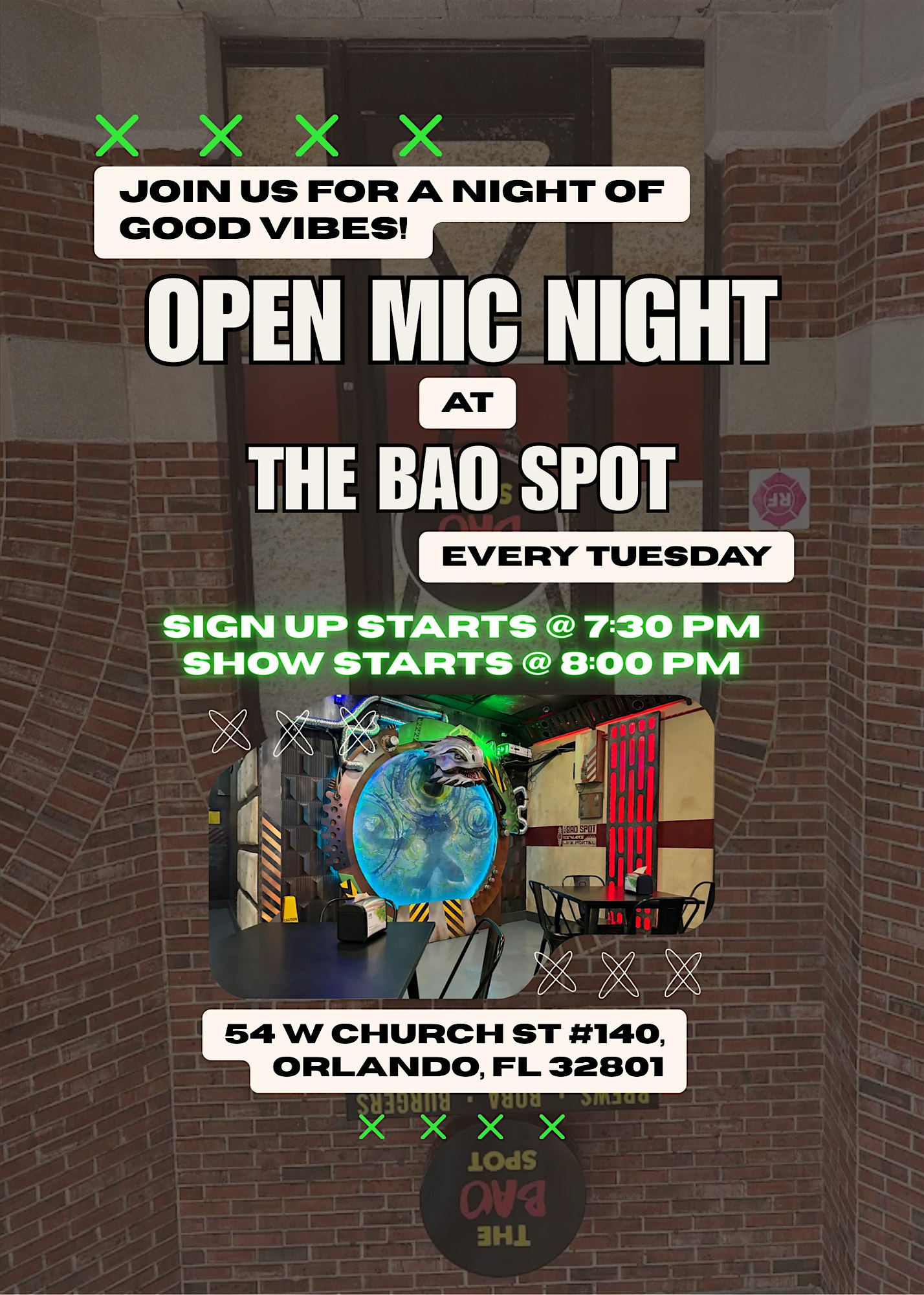 Open Mic Night- The Bao Spot at The Bao Spot – Orlando, FL Open Mic Night- The Bao Spot at The Bao Spot – Orlando, FL 4 4 people viewed this event. Come showcase your talent at The Bao Spot’s Open Mic Night – it’s your time to shine on stage! Comics, singers, rappers, poets etc Tickets-RSVP Link Register for event Date And Time Tuesday, April 28th, 2026 @ 07:00 PM Location 54 West Church Street, Orlando, FL 32801 Event Types Concert or PerformanceFood & Drink Event Category FloridaOrlando Share With Friends Facebook Twitter Linkedin Xing Pinterest