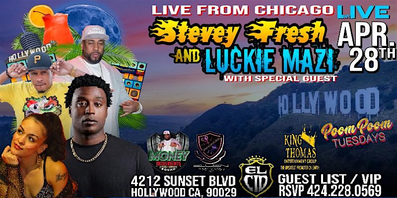 by admin24Feb Stevey Fresh & Luckie Mazi From Chicago Performing Their Hit Song SEXUATION at El Cid – Los Angeles, CA Stevey Fresh & Luckie Mazi From Chicago Performing Their Hit Song SEXUATION at El Cid – Los Angeles, CA 1 1 people viewed this event. Catch Stevey Fresh & Luckie Mazi from Chicago live, rocking their hit track SEXUATION in person! Tickets-RSVP Link Date And Time Tuesday, April 28th, 2026 10:00 PM (PST) Venue El Cid Location 4212 Sunset Boulevard, Los Angeles, CA 90029 Event Types Concert or PerformanceMusic Event Category CaliforniaLos Angeles Share With Friends Facebook Twitter Linkedin Xing Pinterest Share This Post: