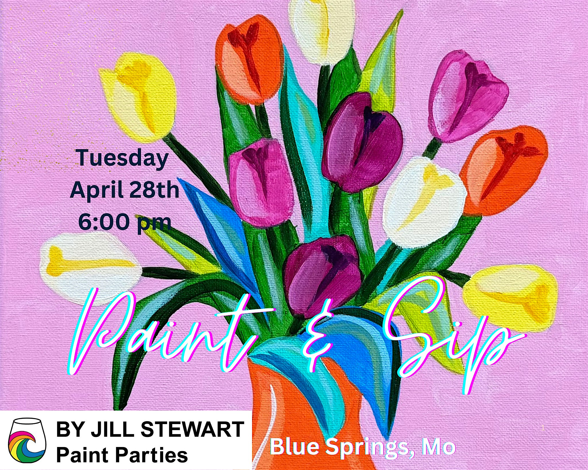 Paint these colorful Tulips in a vase. Perfect for Spring! So fun and easy. All art supplies and instruction are included. I draw the main subject for you. $38/person. Sign up now!