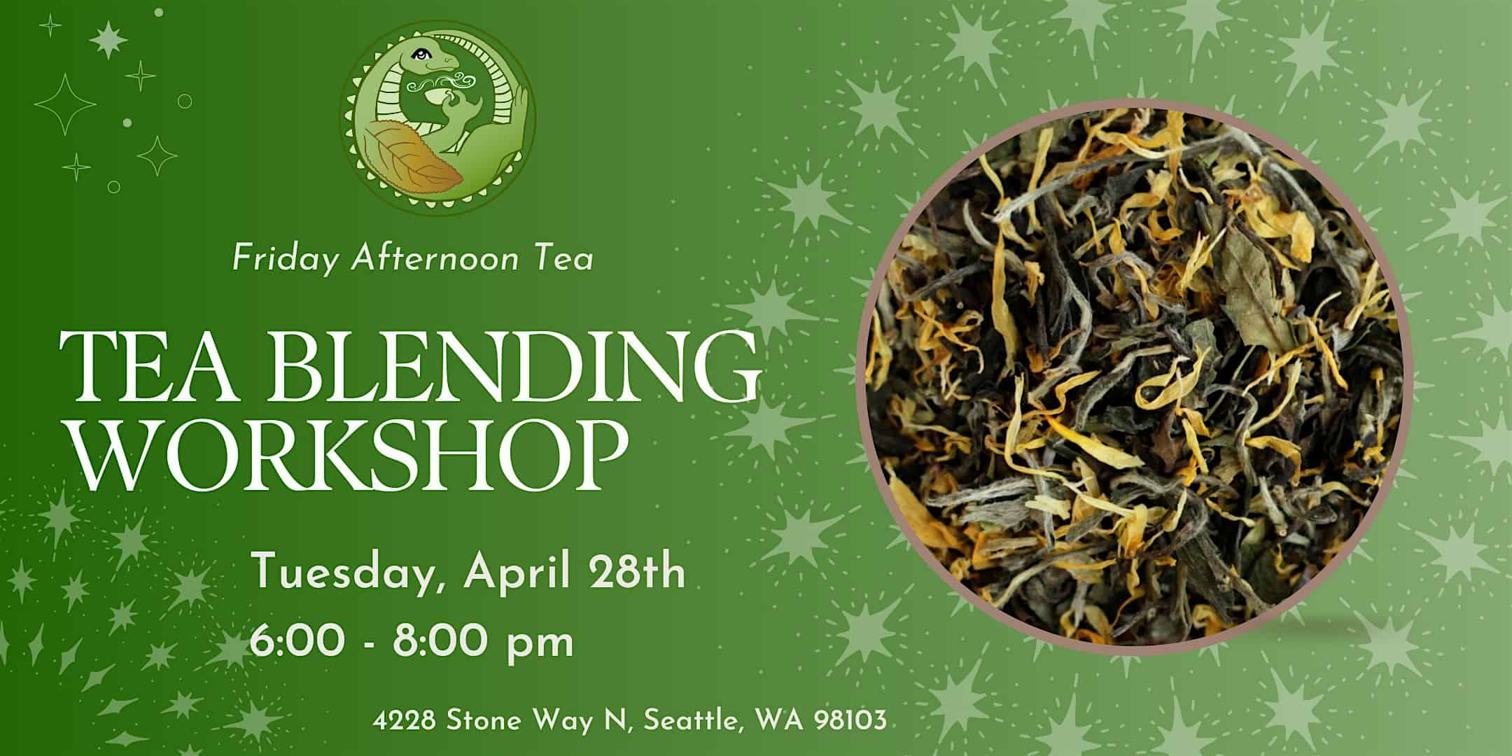 by admin14Feb April Tea Blending Workshop at Friday Afternoon – Seattle, WA April Tea Blending Workshop at Friday Afternoon – Seattle, WA 1 1 people viewed this event. Do you love tea? Are you curious about flavor theory and the science of tea leaves? Learn about these and more at our tea blending workshop! Tickets-RSVP Link Date And Time Wednesday, April 29th, 2026 01:00 AM (PST) Venue Friday Afternoon Location 4228 Stone Way North, Seattle, WA 98103 Event Types Food & Drink Event Category SeattleWashington Share With Friends Facebook Twitter Linkedin Xing Pinterest Share This Post: