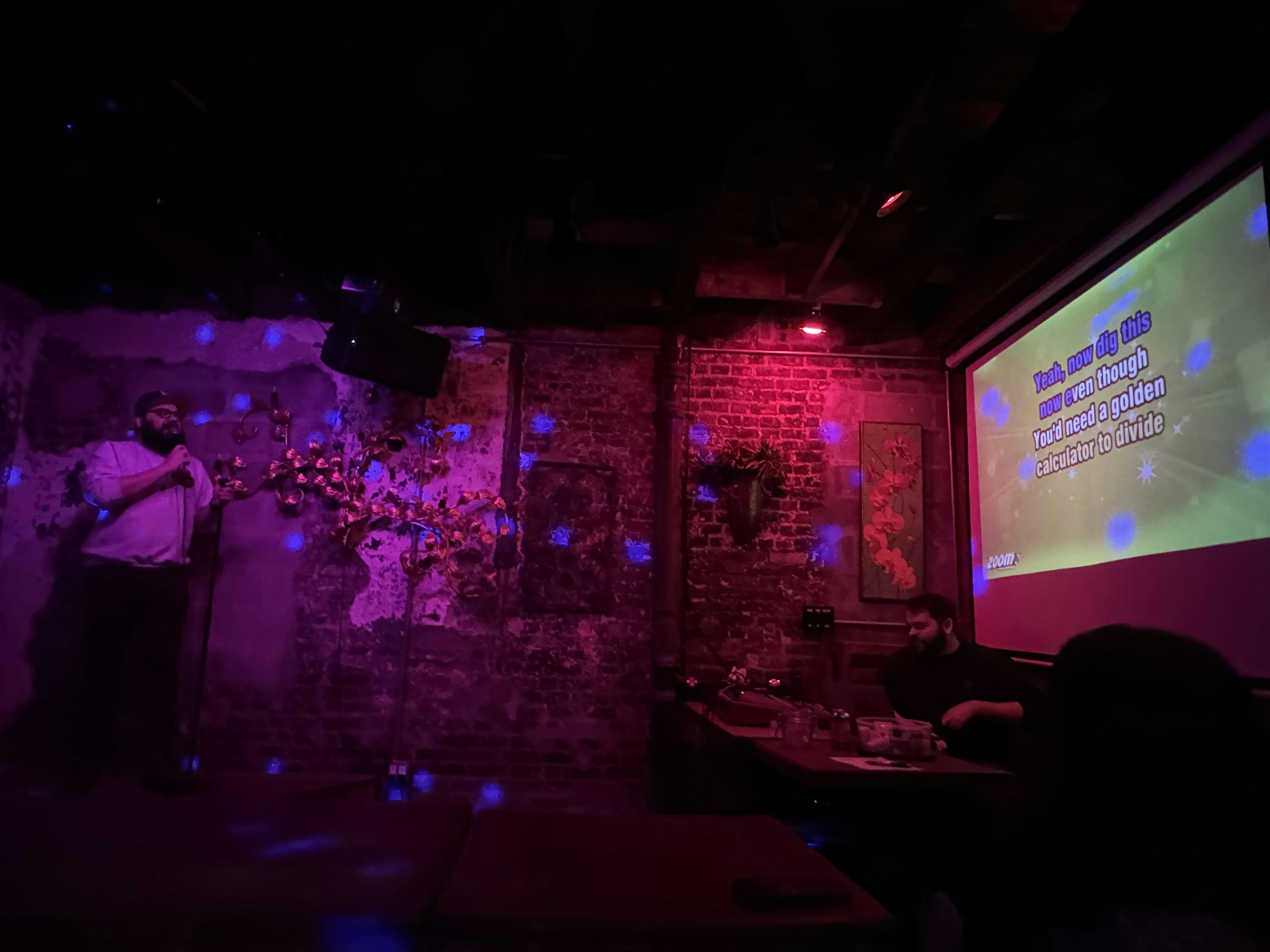 One hour of comedians doing karaoke then telling jokes, one hour of YOU singing (jokes actively discouraged).