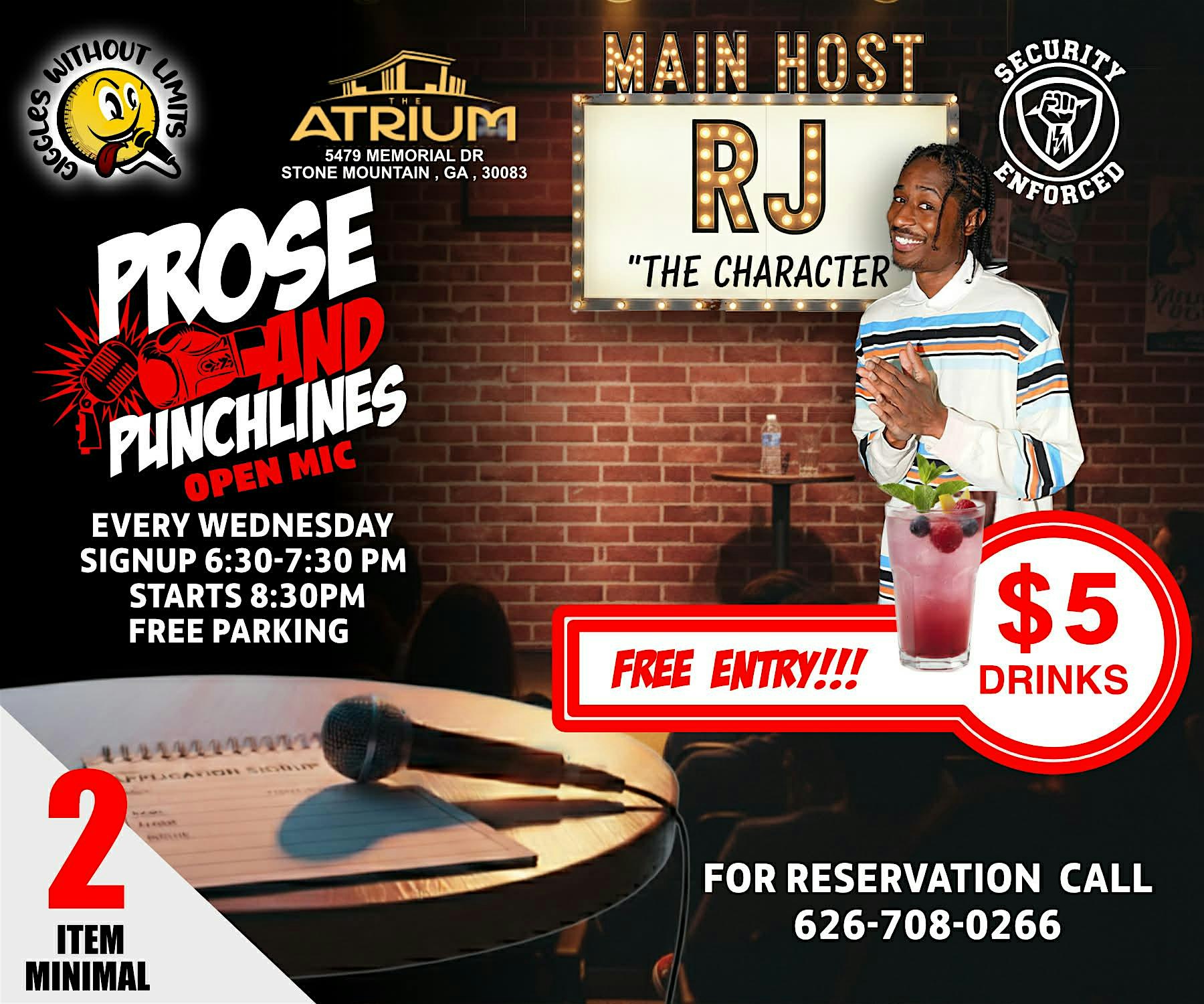 Giggles Without Limits Open Mic at The Atrium – Stone Mountain, GA Giggles Without Limits Open Mic at The Atrium – Stone Mountain, GA 5 5 people viewed this event. Giggles Without Limits Open Mic is the ultimate stage for raw talent, big laughs, and unforgettable vibes. Experience a night where comedian Tickets-RSVP Link Register for event Date And Time Wednesday, April 29th, 2026 @ 08:00 PM Location The Atrium 5479 Memorial Drive, Stone Mountain, GA 30083 Event Types Concert or PerformancePerforming & Visual Arts Event Category Georgia Share With Friends Facebook Twitter Linkedin Xing Pinterest