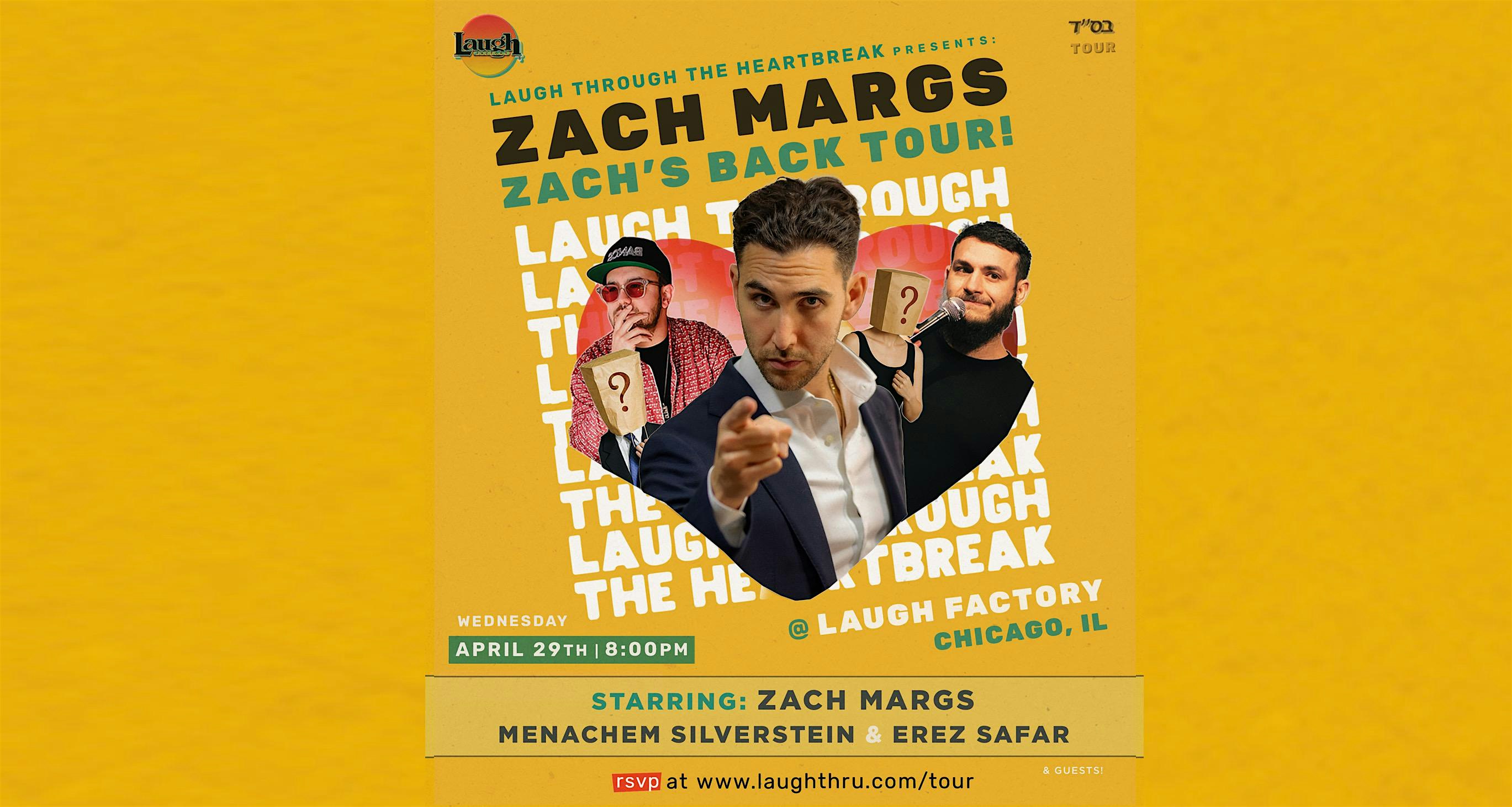 Laugh Through The Heartbreak at Laugh Factory Chicago – Chicago, IL Laugh Through The Heartbreak at Laugh Factory Chicago – Chicago, IL 5 5 people viewed this event. Starring Zach Margs, Menachem Silverstein, and Erez Safar Tickets-RSVP Link Register for event Date And Time Wednesday, April 29th, 2026 @ 08:00 PM Location Laugh Factory Chicago 3175 N. Broadway, Chicago, IL 60657 Event Types Concert or PerformanceFilm, Media & Entertainment Event Category ChicagoIllinois Share With Friends Facebook Twitter Linkedin Xing Pinterest