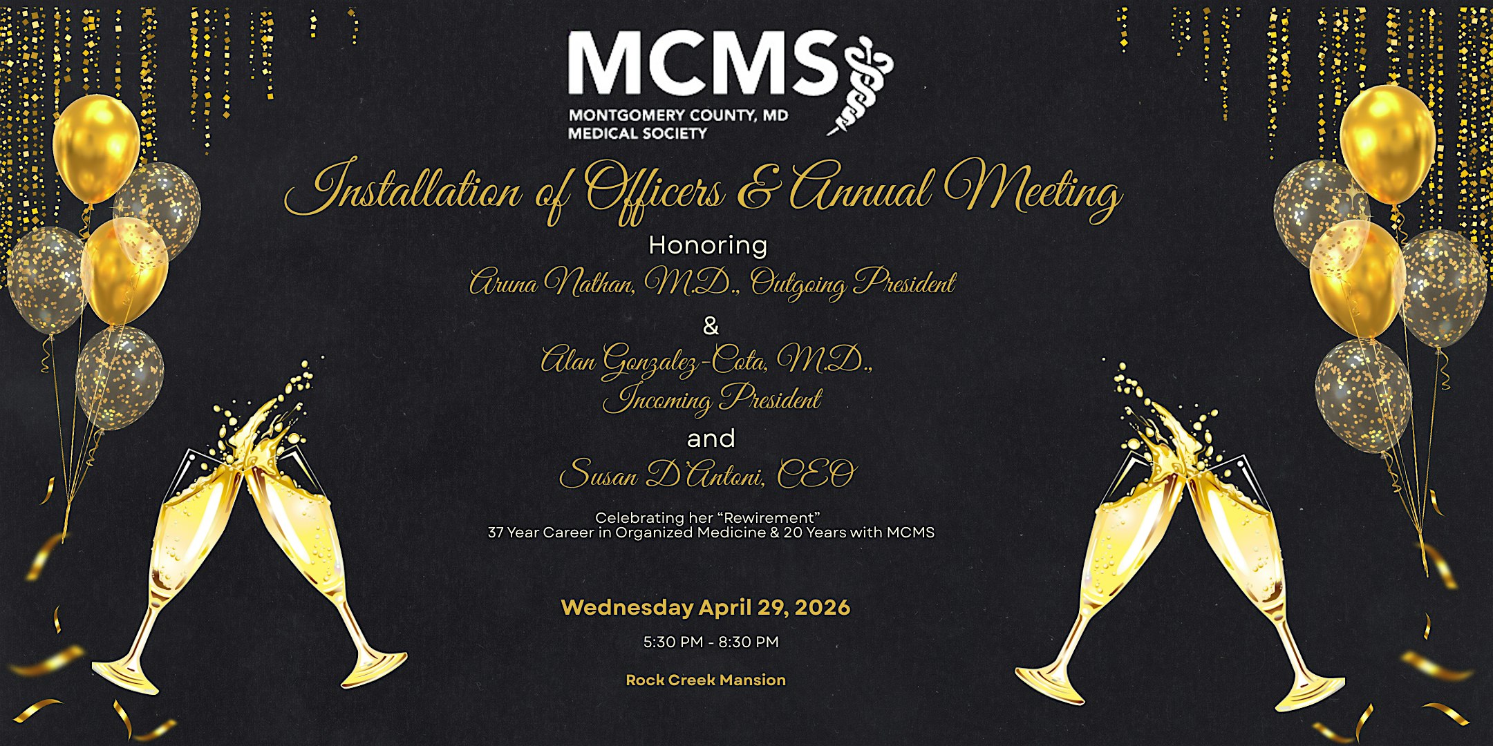 MCMS Installation of Officers & Annual Meeting at The Rock Creek Mansion – Bethesda, MD MCMS Installation of Officers & Annual Meeting at The Rock Creek Mansion – Bethesda, MD 1 1 people viewed this event. The Annual Meeting & Installation of 2026-27 Leadership and Retirement Reception for CEO Susan D’Antoni Tickets-RSVP Link Register for event Date And Time Wednesday, April 29th, 2026 @ 05:00 PM Location 5417 West Cedar Lane, Bethesda, MD 20814 Event Types Meeting or Networking EventOther Event Category MarylandNational Harbor Share With Friends Facebook Twitter Linkedin Xing Pinterest