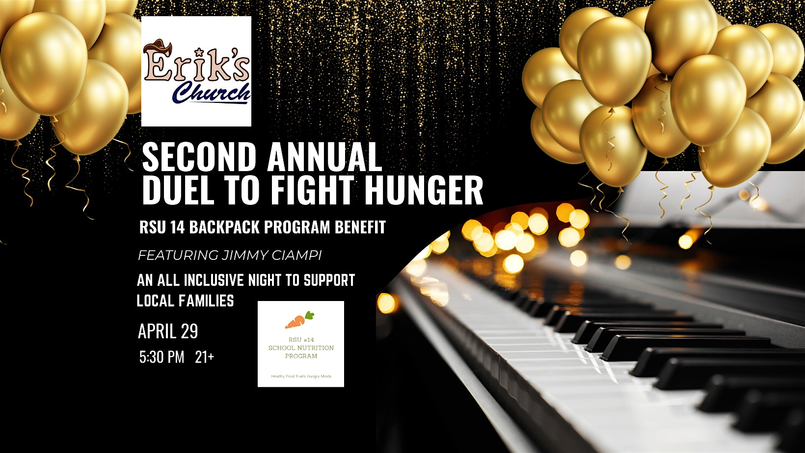 by admin13Feb Second Annual Duel to Fight Hunger (21+) at Eriks Church – Windham, ME Second Annual Duel to Fight Hunger (21+) at Eriks Church – Windham, ME 2 2 people viewed this event. Join us for the second annual Duel to Fight Hunger: RSU 14 Backpack Program Benefit. A night to support local families. (21+) Tickets-RSVP Link Date And Time Wednesday, April 29th, 2026 09:00 PM (PST) Venue Eriks Church Location 824 Roosevelt Trail, Windham, ME 4062 Event Types Concert or PerformanceMusic Event Category Maine Share With Friends Facebook Twitter Linkedin Xing Pinterest Share This Post: