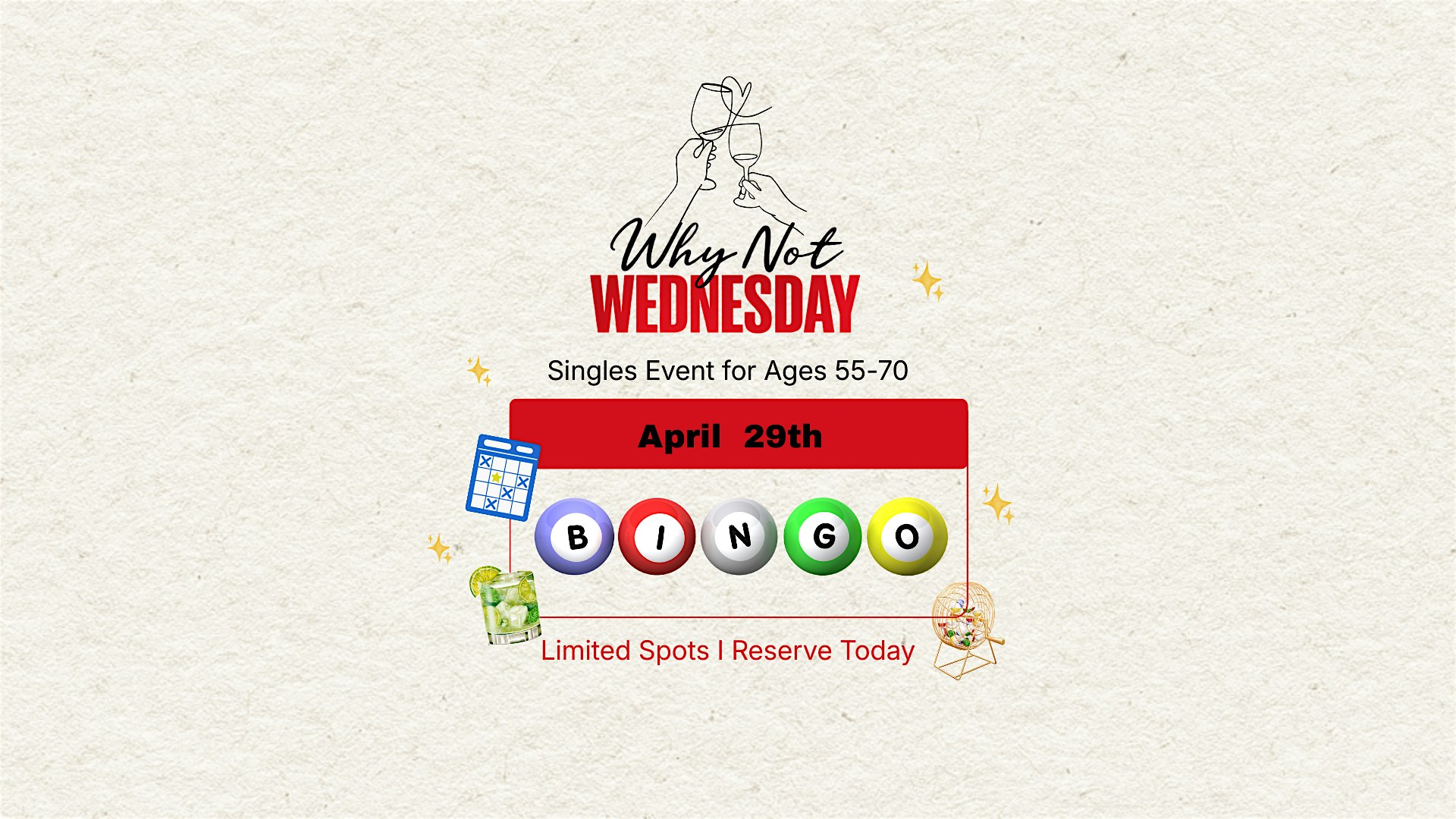 Why Not Wednesday at 1500 SE 19th St – Grimes, IA Why Not Wednesday at 1500 SE 19th St – Grimes, IA 3 3 people viewed this event. No pressure. No awkward setups. Just an enjoyable, intentional space to connect with others over bingo and good vibes. Tickets-RSVP Link Register for event Date And Time Wednesday, April 29th, 2026 @ 06:00 PM Location 1500 Southeast 19th Street, Grimes, IA 50111 Event Types OtherParty or Social Gathering Event Category Iowa Share With Friends Facebook Twitter Linkedin Xing Pinterest