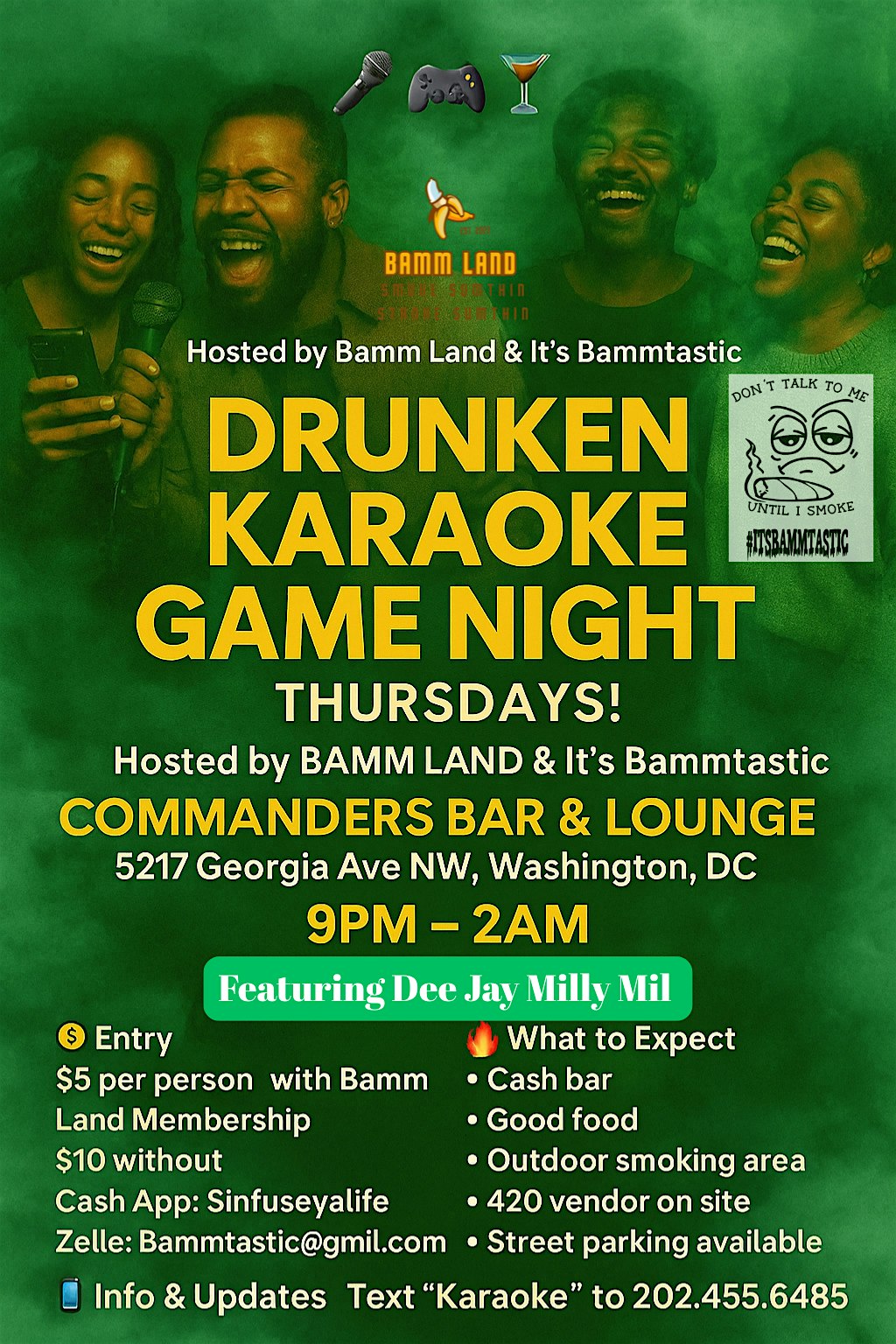 Drunken Karaoke Game Night at 5217 Georgia Ave NW – Washington, DC Drunken Karaoke Game Night at 5217 Georgia Ave NW – Washington, DC 3 3 people viewed this event. DRUNKEN KARAOKE GAME NIGHT — THURSDAYS! Hosted by Bamm Land & It’s Bammtastic Commanders Bar & Lounge 5217 Georgia Ave NW, Tickets-RSVP Link Register for event Date And Time Thursday, April 30th, 2026 @ 09:00 PM Location 5217 Georgia Ave NW 5217 Georgia Avenue Northwest, Washington, DC 20011 Event Types Food & DrinkParty or Social Gathering Event Category Washington DC Share With Friends Facebook Twitter Linkedin Xing Pinterest