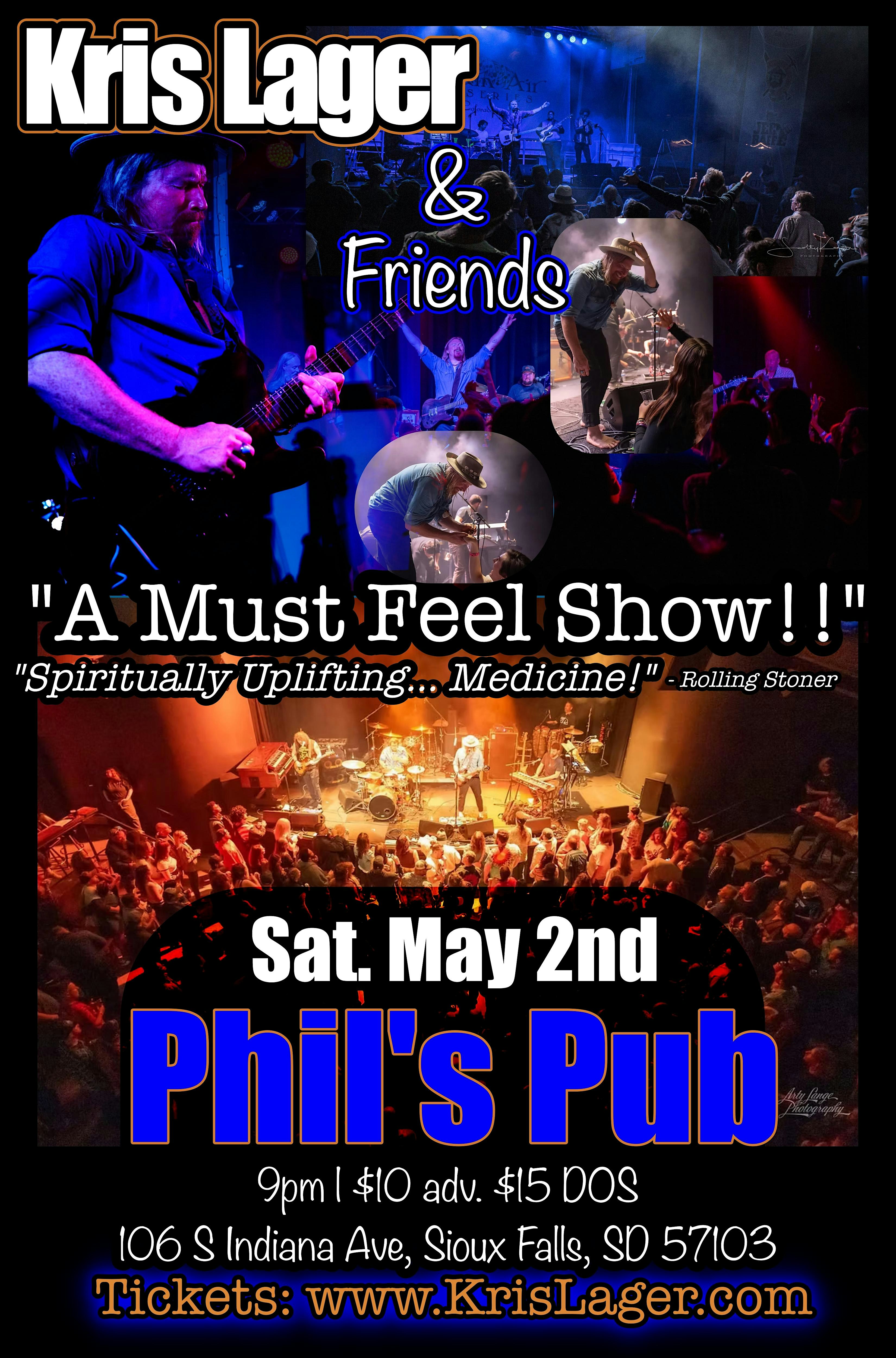 Kris Lager & Friends Return To Sioux Falls! at Phil’s Pub – Sioux Falls, SD Kris Lager & Friends Return To Sioux Falls! at Phil’s Pub – Sioux Falls, SD 3 3 people viewed this event. Kris Lager and crew bring their patented Feel Good Funky Jams to Sioux Falls! Tickets-RSVP Link Register for event Date And Time Thursday, April 30th, 2026 @ 10:00 AM Location 106 South Indiana Avenue, Sioux Falls, SD 57103 Event Types Concert or PerformanceMusic Event Category South Dakota Share With Friends Facebook Twitter Linkedin Xing Pinterest