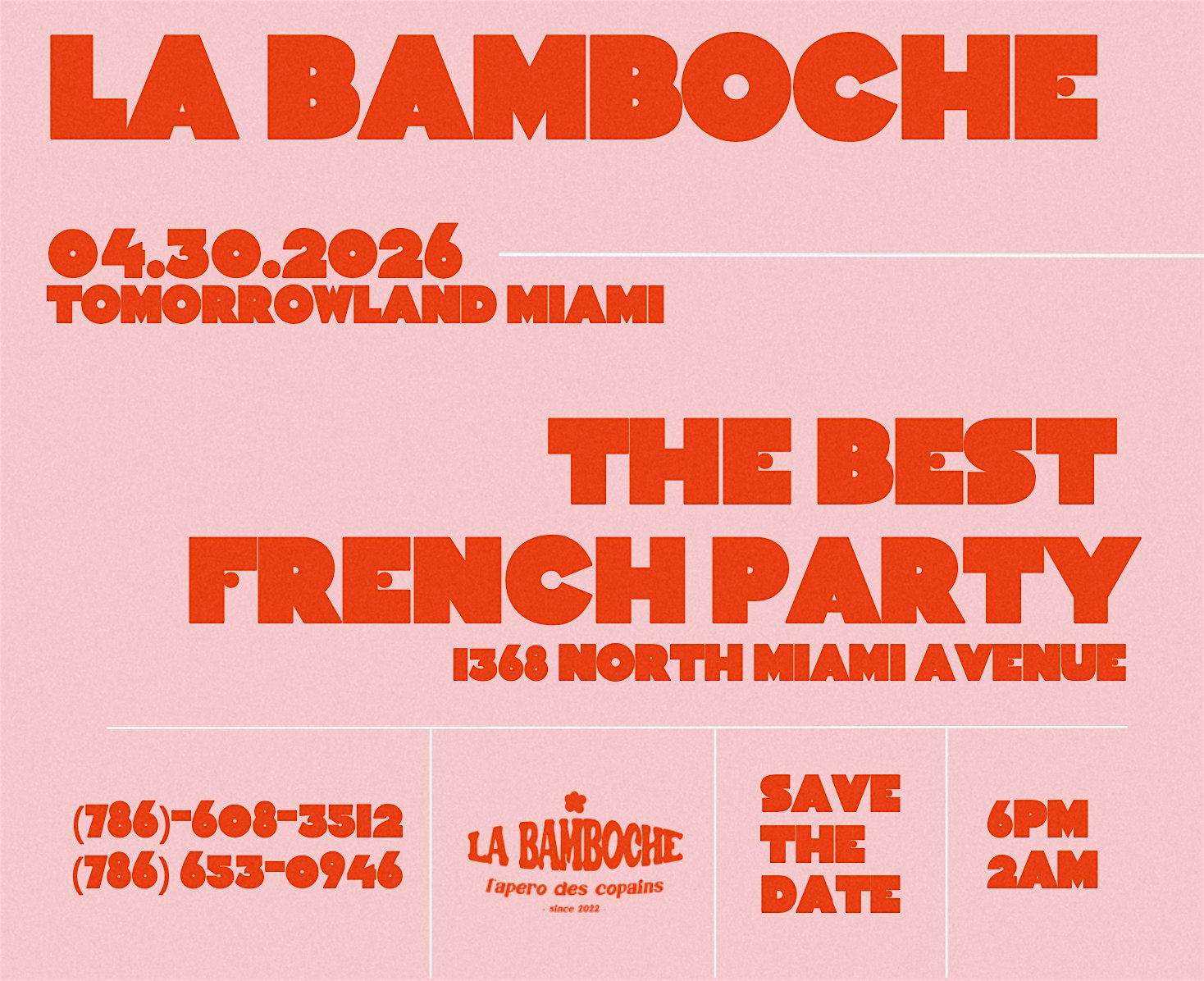 LA BAMBOCHE MIAMI at 1368 N Miami Ave – Miami, FL LA BAMBOCHE MIAMI at 1368 N Miami Ave – Miami, FL 3 3 people viewed this event. La Bamboche, Paris’ legendary “apéro des copains”, lands in Miami! DJs spinning old school & new tracks, French vibe, food/drinks & friends! Tickets-RSVP Link Register for event Date And Time Thursday, April 30th, 2026 @ 06:00 PM Location 1368 N Miami Ave 1368 North Miami Avenue, Miami, FL 33136 Event Types MusicParty or Social Gathering Event Category FloridaMiami Share With Friends Facebook Twitter Linkedin Xing Pinterest