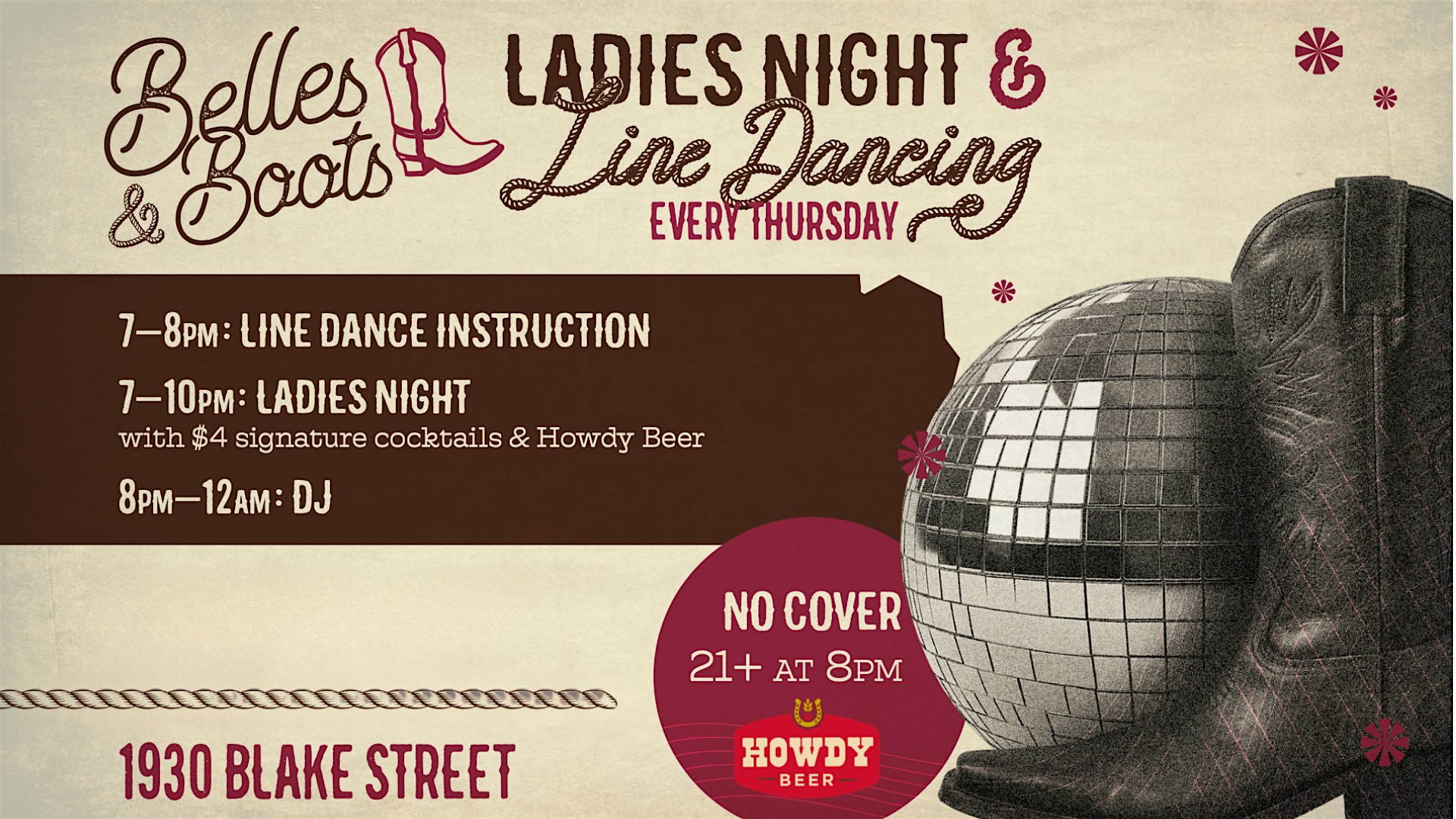 Ladies Night & Line Dancing at Belles & Boots – Denver, CO Ladies Night & Line Dancing at Belles & Boots – Denver, CO 7 7 people viewed this event. Ladies Night & Line Dancing at Belles & Boots Tickets-RSVP Link Register for event Date And Time Thursday, April 30th, 2026 @ 07:00 PM Location Belles & Boots 1930 Blake Street, Denver, CO 80202 Event Types Community & CultureParty or Social Gathering Event Category ColoradoDenver Share With Friends Facebook Twitter Linkedin Xing Pinterest