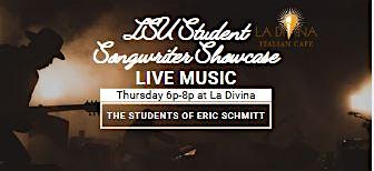 by admin13Feb LSU Student Songwriter Showcase: Live Music Thurs APRIL 30th 6p-8p at La Divina Italian Cafe – Baton Rouge, LA LSU Student Songwriter Showcase: Live Music Thurs APRIL 30th 6p-8p at La Divina Italian Cafe – Baton Rouge, LA 2 2 people viewed this event. LIVE original music with the students of Eric Schmitt. Enjoy the LSU Students Songwriter’s Club Showcase with wine, supper and gelato! Tickets-RSVP Link Date And Time Thursday, April 30th, 2026 11:00 PM (PST) Venue La Divina Italian Cafe Location 3535 Perkins Road, Baton Rouge, LA 70808 Event Types Concert or PerformanceMusic Event Category Baton RougeLouisiana Share With Friends Facebook Twitter Linkedin Xing Pinterest Share This Post: