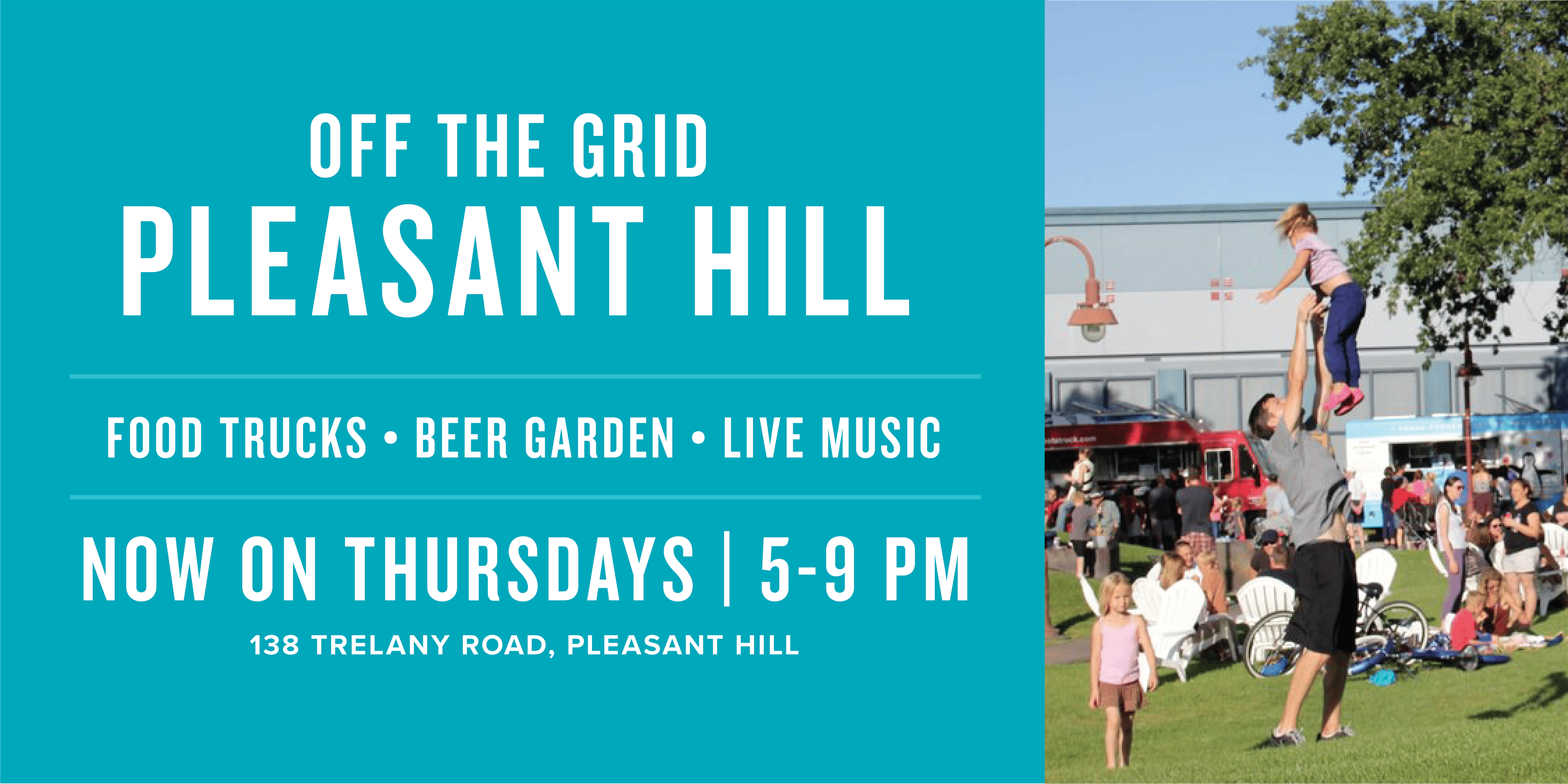 We’re partnering with local community organizations weekly, supporting causes from youth soccer to pet adoptions. Off the Grid Pleasant Hill is very family friendly – bring your kids, friends, colleagues, and we guarantee everyone will have a great time!
