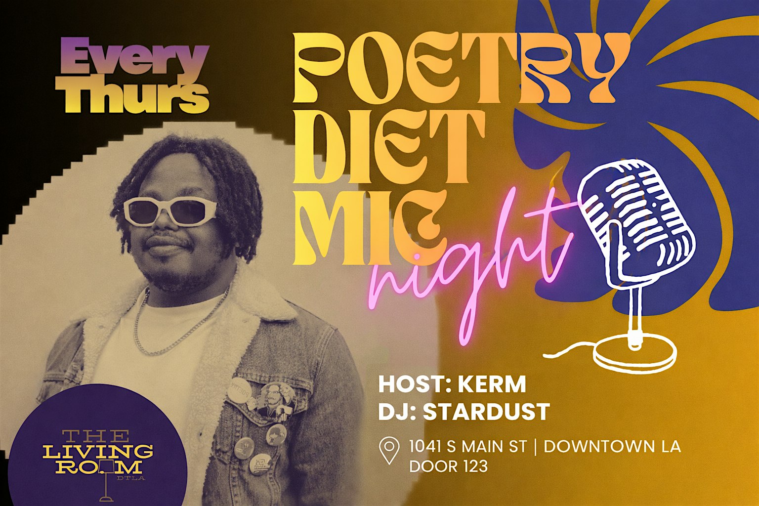 Poetry Diet Mic Night is a weekly open mic dedicated to language, rhythm, and truth-telling. Set inside The Living Room DTLA, this night creates space for poets, writers, and creatives to share their work in an intimate, supportive atmosphere.