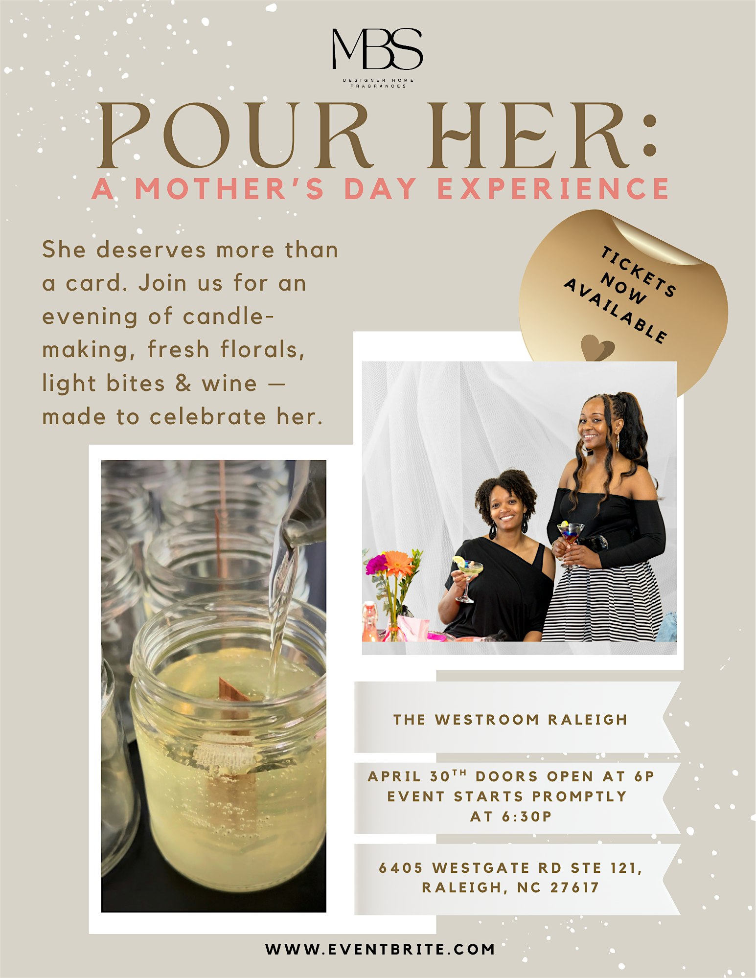 Pour Her: A Mother’s Day Experience is an intimate, hands-on celebration for the moms, aunties, wives, mother figures, mother-in-laws, and every woman who has poured into someone else’s life. Bring your husband, your son, your daughter, your best friend — everyone is welcome, and everyone leaves with something beautiful.