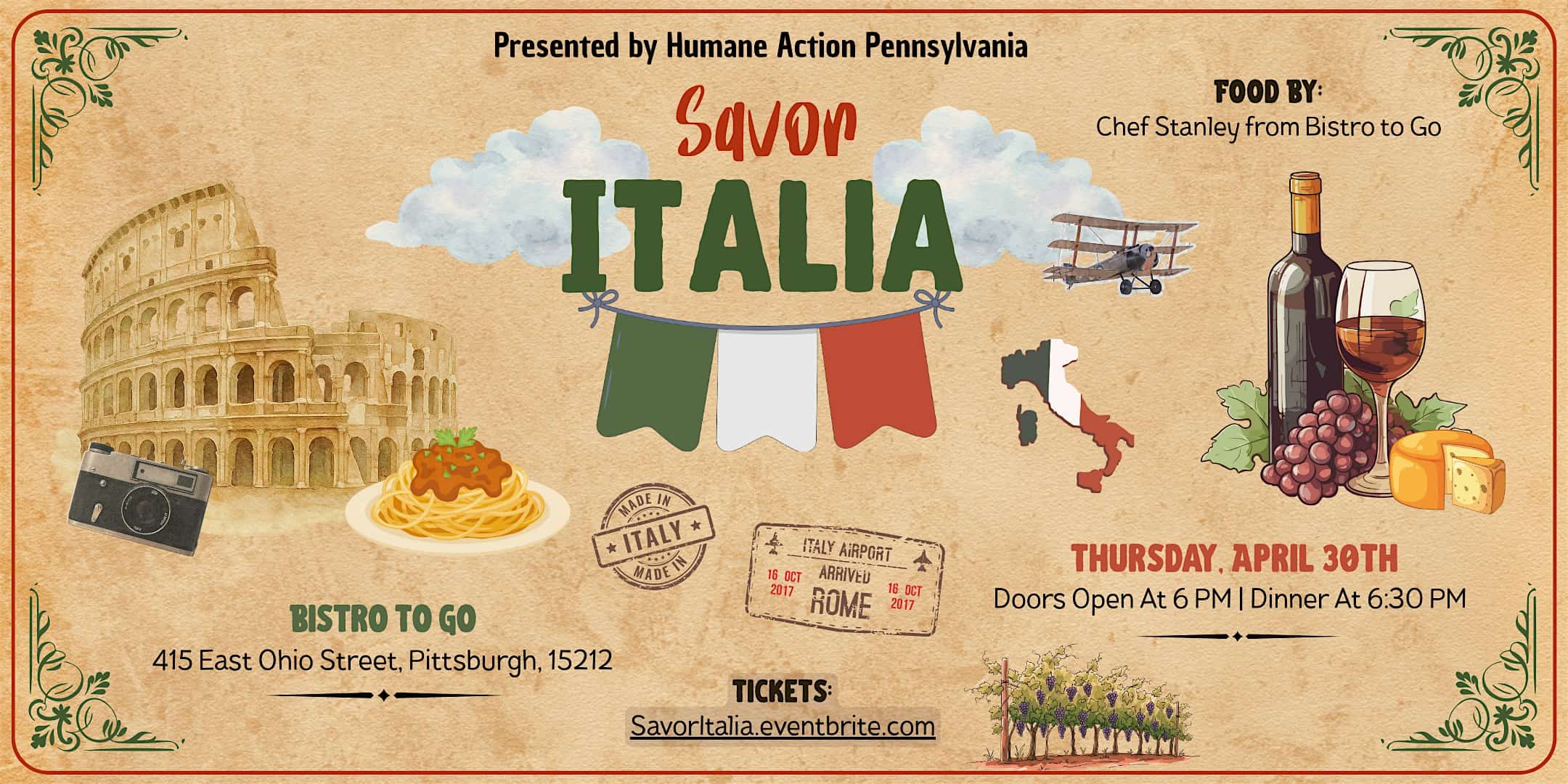 by admin14Feb Savor Italia at Bistro To Go Catering – Pittsburgh, PA Savor Italia at Bistro To Go Catering – Pittsburgh, PA 1 1 people viewed this event. Experience plant-based Italian cuisine, open bar, and an exclusive guided talk on each course—benefiting Humane Action Pennsylvania. Tickets-RSVP Link Date And Time Thursday, April 30th, 2026 10:00 PM (PST) Venue Bistro To Go Catering Location 415 East Ohio Street, Pittsburgh, PA 15212 Event Types Food & Drink Event Category PennsylvaniaPittsburgh Share With Friends Facebook Twitter Linkedin Xing Pinterest Share This Post: