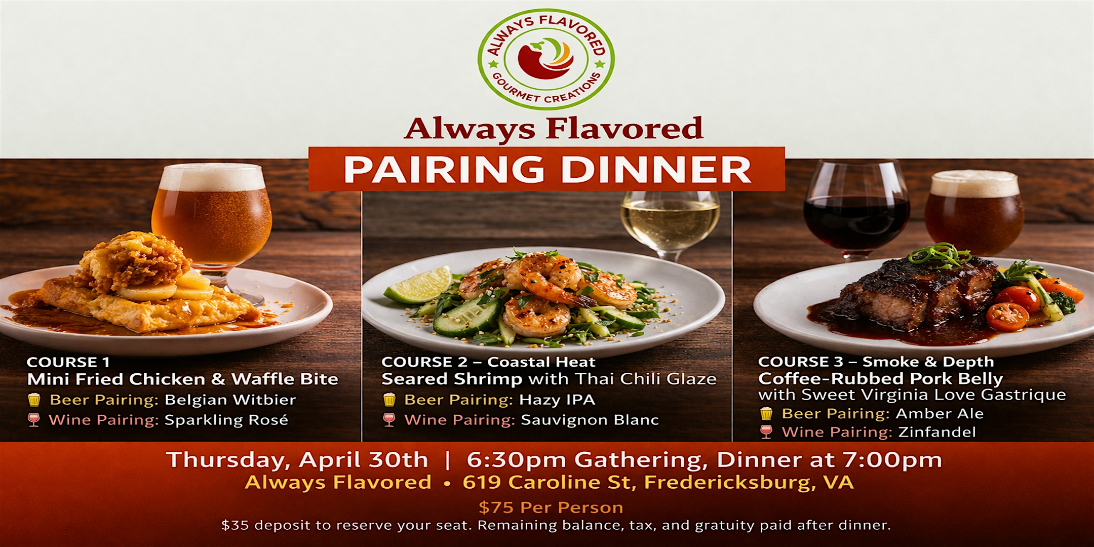 Guests will gather at 6:30 PM, with dinner beginning at 7:00 PM at Always Flavored | 619 Caroline St, Fredericksburg, VA
