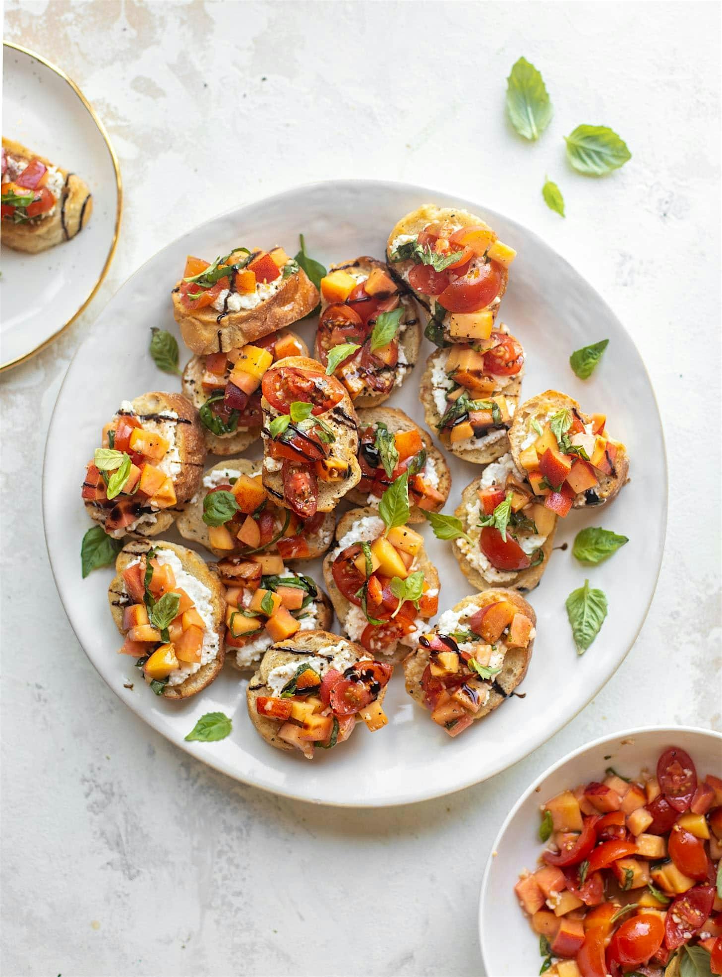 • Peach & Burrata Crostini with Burst Tomatoes