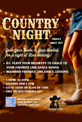 Country Night at Mercury Music LoungeGrab your boots whether youre brand new or already have your favorite line dances – youre welcomed on the dance floor. DJ spinning your favorite country line dance songs.Requests welcome all night! Beginner-Friendly Line Dance LessonsLessons at **8:00 PM & 9:00 PM** so anyone can jump in and learn. **Event Time:** 7:30 PM 10:30 PM **Admission:** $15 at the door or click event ticket link. **Free on-site parking lot**Come for the music, learn a few dances, and stay for a great night out on the floor.Boots optional good vibes required.