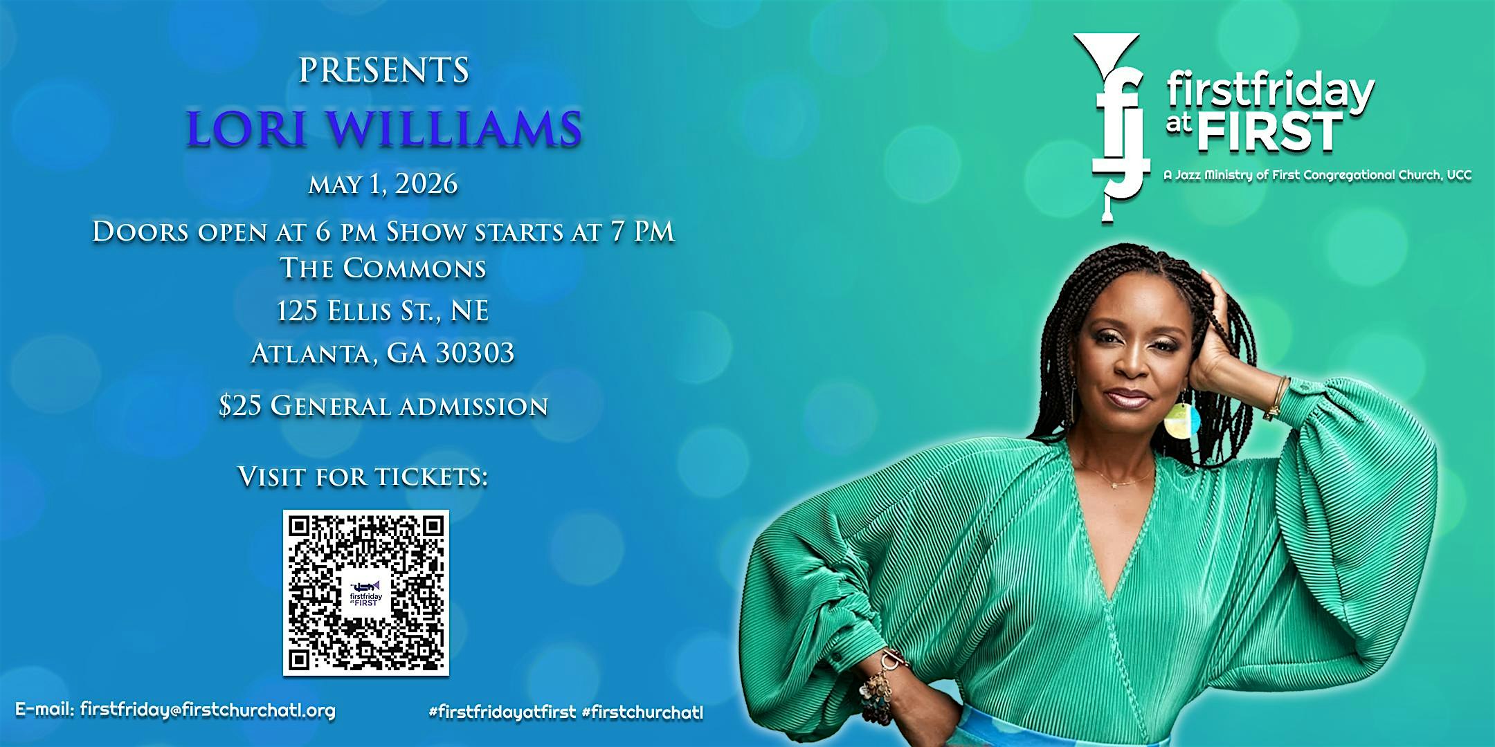by admin13Feb First Friday at First “LIVE”- MAY 2026 – Lori Williams at 125 Ellis St NE – Atlanta, GA First Friday at First “LIVE”- MAY 2026 – Lori Williams at 125 Ellis St NE – Atlanta, GA 2 2 people viewed this event. Welcome to First Friday at First “LIVE” with some of Atlanta’s top jazz performers gracing the stage! Tickets-RSVP Link Date And Time Friday, May 1st, 2026 11:00 PM (PST) Venue 125 Ellis St NE Location 125 Ellis Street Northeast, Atlanta, GA 30303 Event Types Concert or PerformanceMusic Event Category AtlantaGeorgia Share With Friends Facebook Twitter Linkedin Xing Pinterest Share This Post: