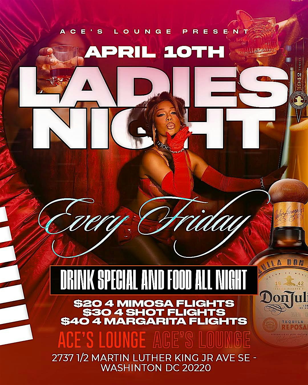 Ladies Night at Ace’s Lounge – Washington, DC Ladies Night at Ace’s Lounge – Washington, DC 6 6 people viewed this event. Calling all Ladies to come out and have a good time. Drink specials all night. every Friday All Spring & Summer Tickets-RSVP Link Register for event Date And Time Friday, May 1st, 2026 @ 07:00 PM Location Ace's Lounge 2737 Martin Luther King Junior Avenue Southeast, Washington, DC 20032 Event Types Food & DrinkParty or Social Gathering Event Category Washington DC Share With Friends Facebook Twitter Linkedin Xing Pinterest
