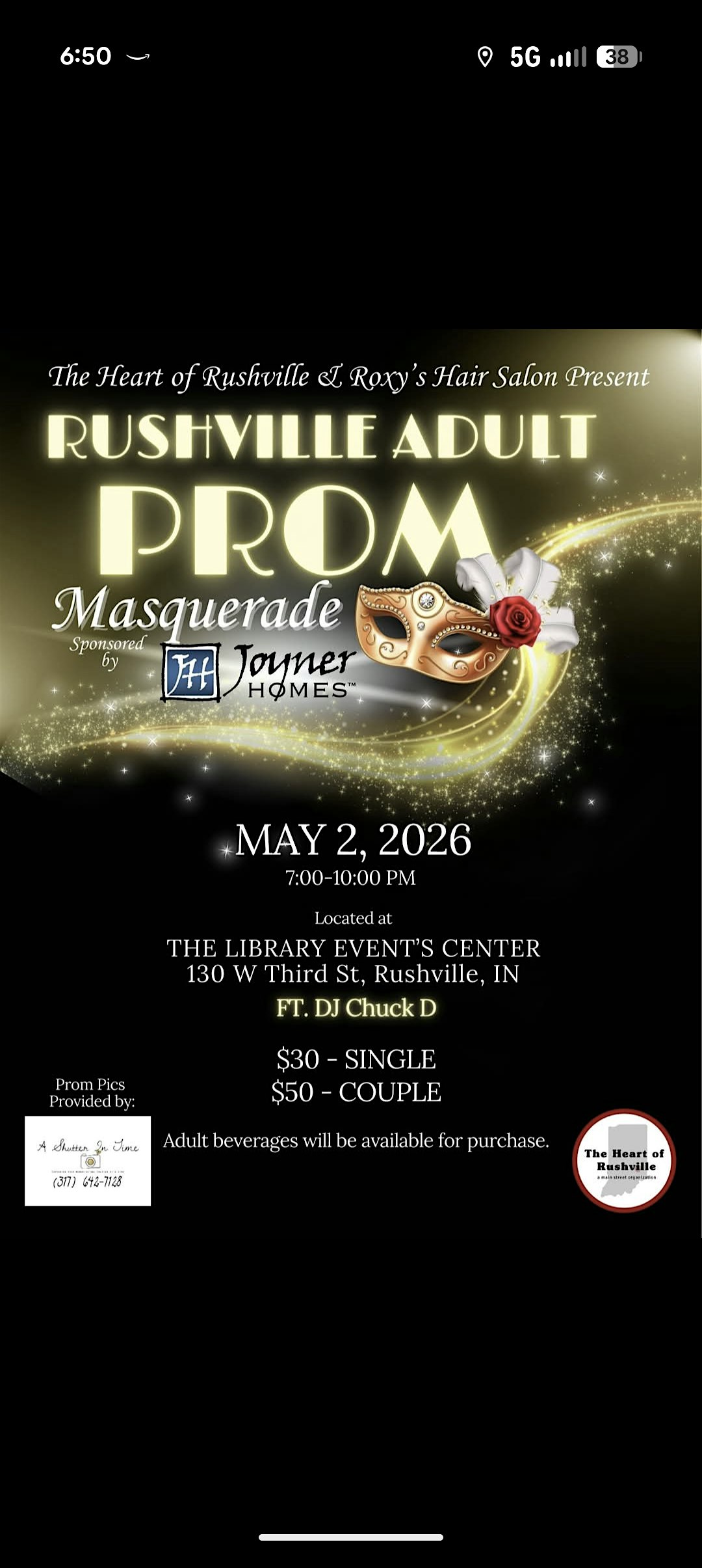 by admin13Feb Adult Prom 2026 at 130 W 3rd St – Rushville, IN Adult Prom 2026 at 130 W 3rd St – Rushville, IN 4 4 people viewed this event. A night to dance and have fun. All proceeds go to future Heart Of Rushville events and dances. Tickets-RSVP Link Date And Time Saturday, May 2nd, 2026 11:00 PM (PST) Venue 130 W 3rd St Location 130 West 3rd Street, Rushville, IN 46173 Event Types Community & CultureParty or Social Gathering Event Category Indiana Share With Friends Facebook Twitter Linkedin Xing Pinterest Share This Post: