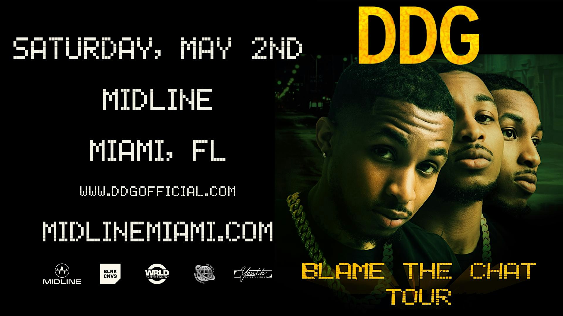 DDG – Blame The Chat Tour at Midline Miami – Miami, FL DDG – Blame The Chat Tour at Midline Miami – Miami, FL 2 2 people viewed this event. MIAMI! May 2nd we’re blaming the chat with DDG at Midline Miami. Tickets-RSVP Link Register for event Date And Time Saturday, May 2nd, 2026 @ 06:00 PM Location 2221 Northwest Miami Court, Miami, FL 33127 Event Types MusicTour Event Category FloridaMiami Share With Friends Facebook Twitter Linkedin Xing Pinterest