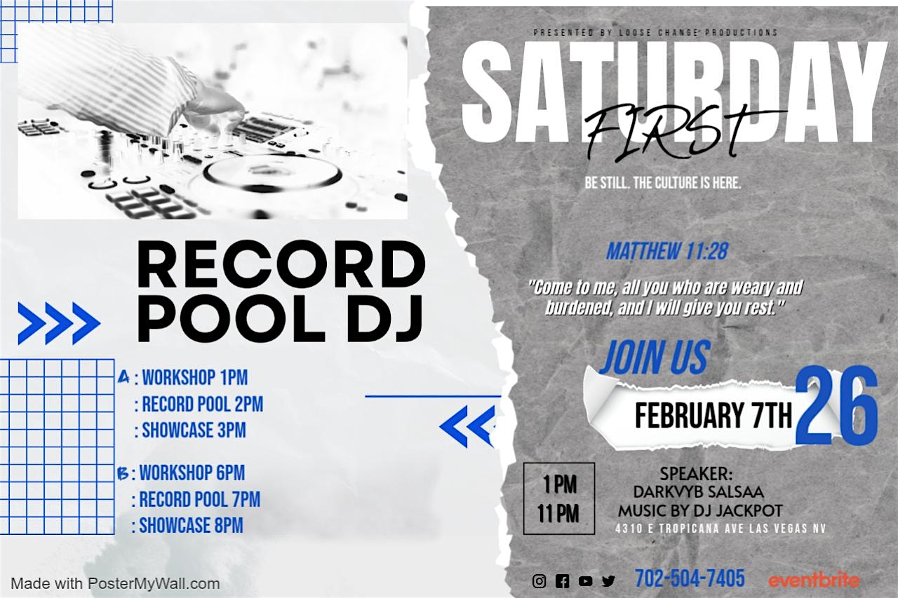 DJ RECORD POOL at 4310 E Tropicana Ave – Las Vegas, NV DJ RECORD POOL at 4310 E Tropicana Ave – Las Vegas, NV 4 4 people viewed this event. : Workshop 1PM : record pool 2PM : showcase 3PM Tickets-RSVP Link Register for event Date And Time Saturday, May 2nd, 2026 @ 01:00 PM Location 4310 East Tropicana Avenue, Las Vegas, NV 89121 Event Types Concert or PerformanceMusic Event Category Las VegasNevada Share With Friends Facebook Twitter Linkedin Xing Pinterest