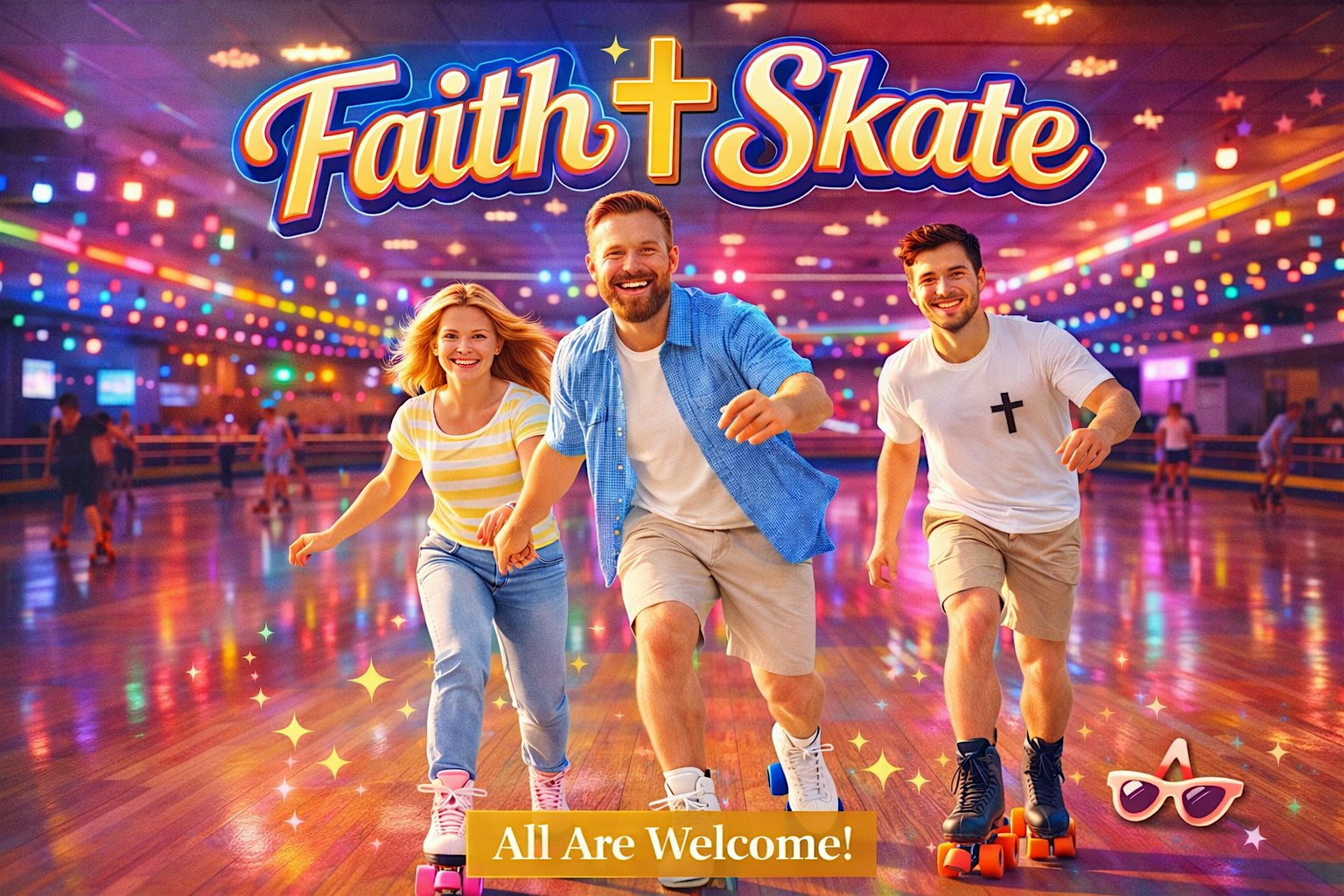 Faith & Skate Day is a private event meant for anybody seeking a closer relationship with Jesus Christ. Here you will find Jesus on skates along with his children! Faith & Skate Day offers a fun time through rollerblading, games, worship music to lift and build the spirit, fun quick sermons in between, and food! Come and enjoy your time with friends and family of the faith, build community, get your inner fire kickstarted and get your morning started right with worship and fun to create life changing memories you, your friends, and your family will cherish for the rest of your lives!
