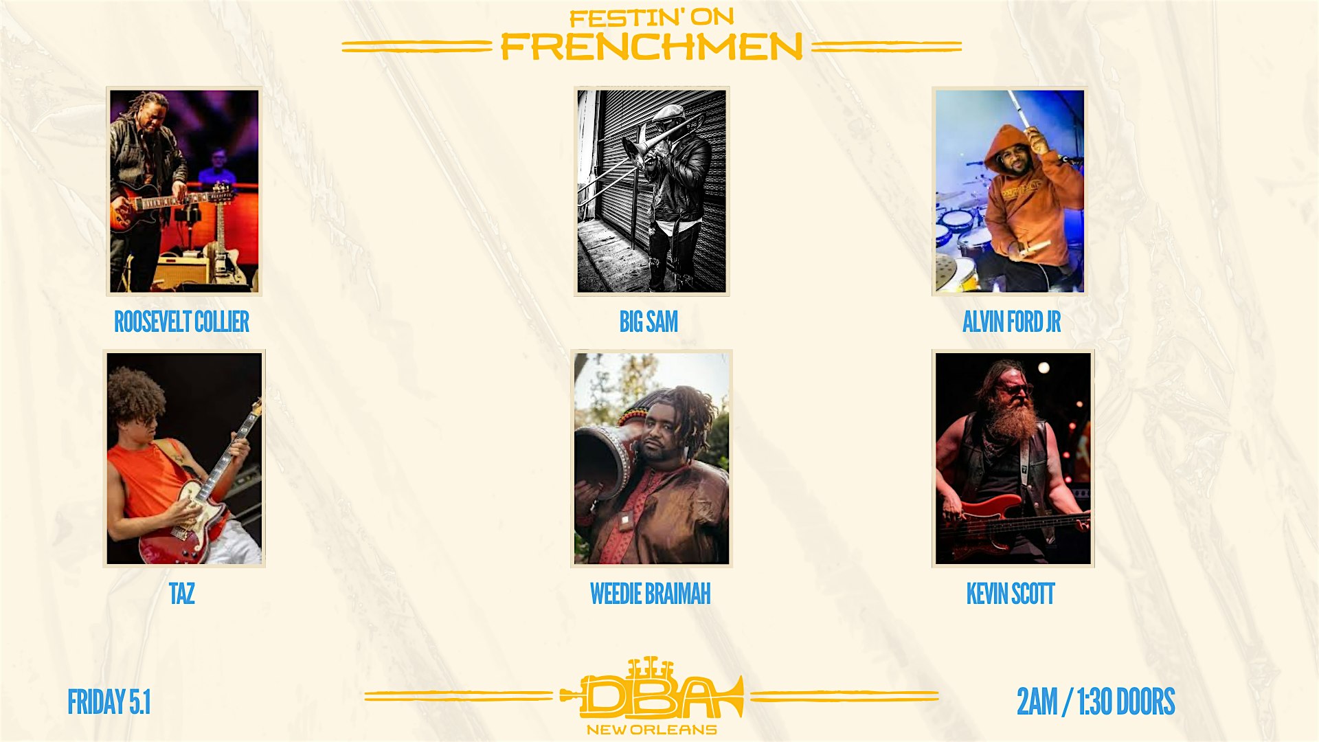 Festin’ on Frenchmen : Roosevelt Collier’s All Night Jam at DBA – New Orleans, LA Festin’ on Frenchmen : Roosevelt Collier’s All Night Jam at DBA – New Orleans, LA 3 3 people viewed this event. Roosevelt Collier, Big Sam Williams, Alvin Ford Jr, Taz, Weedie Braimah, Kevin Scott Biggest Jam of the weekend ANYWHERE in the city. You won’t want to miss this. Tickets-RSVP Link Register for event Date And Time Saturday, May 2nd, 2026 @ 02:00 AM Location 618 Frenchmen Street, New Orleans, LA 70116 Event Types Concert or PerformanceMusic Event Category LouisianaNew Orleans Share With Friends Facebook Twitter Linkedin Xing Pinterest