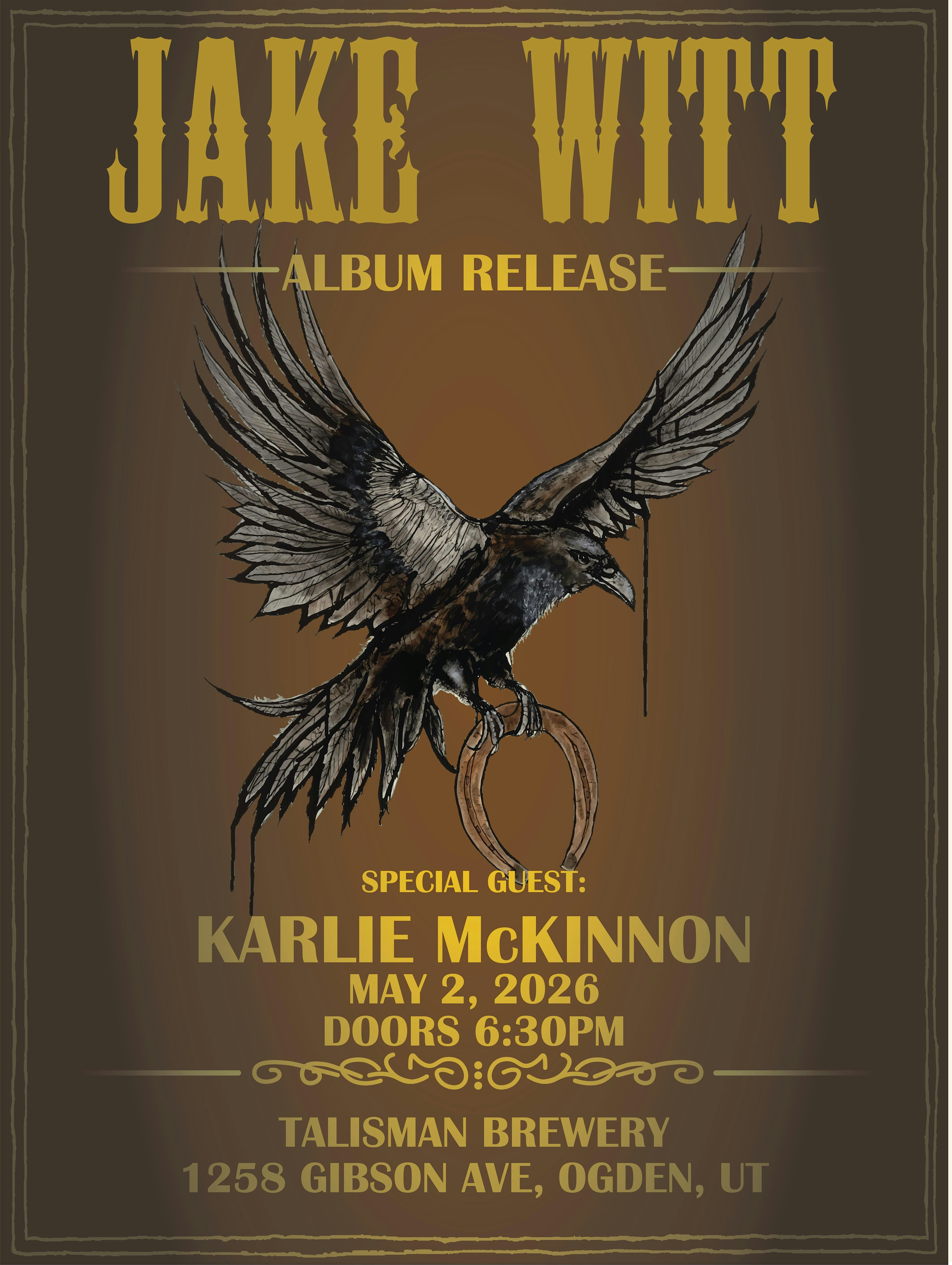 Jake Witt – “Luck” Album Release at Talisman Brewing Company – Ogden, UT Jake Witt – “Luck” Album Release at Talisman Brewing Company – Ogden, UT 5 5 people viewed this event. Jake Witt brings his new album “Luck” to Ogden, UT on May 2, 2026—full band set with a special guest, Karlie McKinnon. (Limited tickets available due to venue size)$12 presale Tickets-RSVP Link Register for event Date And Time Saturday, May 2nd, 2026 @ 07:00 PM Location Talisman Brewing Company 1258 Gibson Avenue, Ogden, UT 84404 Event Types Concert or PerformanceMusic Event Category Utah Share With Friends Facebook Twitter Linkedin Xing Pinterest