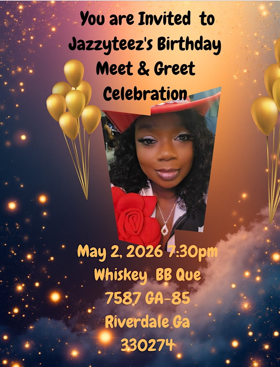 by admin13Feb Jazzy’s Birthday Meet & Greet Celebration at Whiskey BB Que – Riverdale, GA Jazzy’s Birthday Meet & Greet Celebration at Whiskey BB Que – Riverdale, GA 1 1 people viewed this event. Grown folks celebrating under one roof. Colors are red white & black. No sneakers or t-shirts club Attire (Buffet included) cash bar Tickets-RSVP Link Date And Time Saturday, May 2nd, 2026 11:00 PM (PST) Venue Whiskey BB Que Location 7587 Georgia 85, Riverdale, GA 30274 Event Types Party or Social Gathering Event Category AtlantaGeorgia Share With Friends Facebook Twitter Linkedin Xing Pinterest Share This Post: