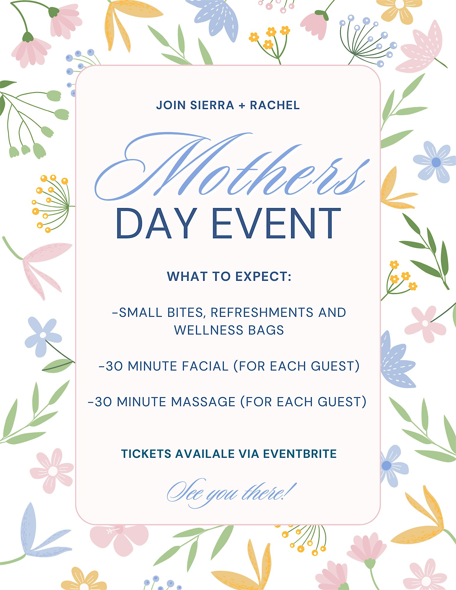 Get ready to pamper and spend time with the amazing moms in your life with a hour of massages, facials, small bites and wellness bags!