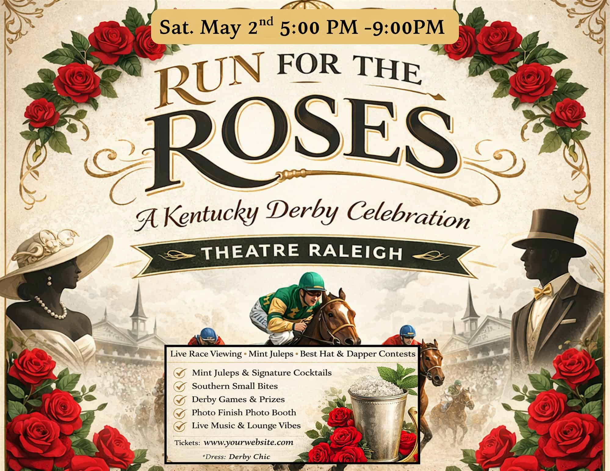 by admin14Feb Run for the Roses: A Kentucky Derby Celebration at Theatre Raleigh – Raleigh, NC Run for the Roses: A Kentucky Derby Celebration at Theatre Raleigh – Raleigh, NC 2 2 people viewed this event. An Elegant evening celebrating the excitement and tradition of the Kentucky Derby! Dress in your finest Derby chic! Tickets-RSVP Link Date And Time Saturday, May 2nd, 2026 09:00 PM (PST) Venue Theatre Raleigh Location 6638 Old Wake Forest Road, Raleigh, NC 27616 Event Types Party or Social GatheringSeasonal & Holiday Event Category North CarolinaRaleigh Share With Friends Facebook Twitter Linkedin Xing Pinterest Share This Post: