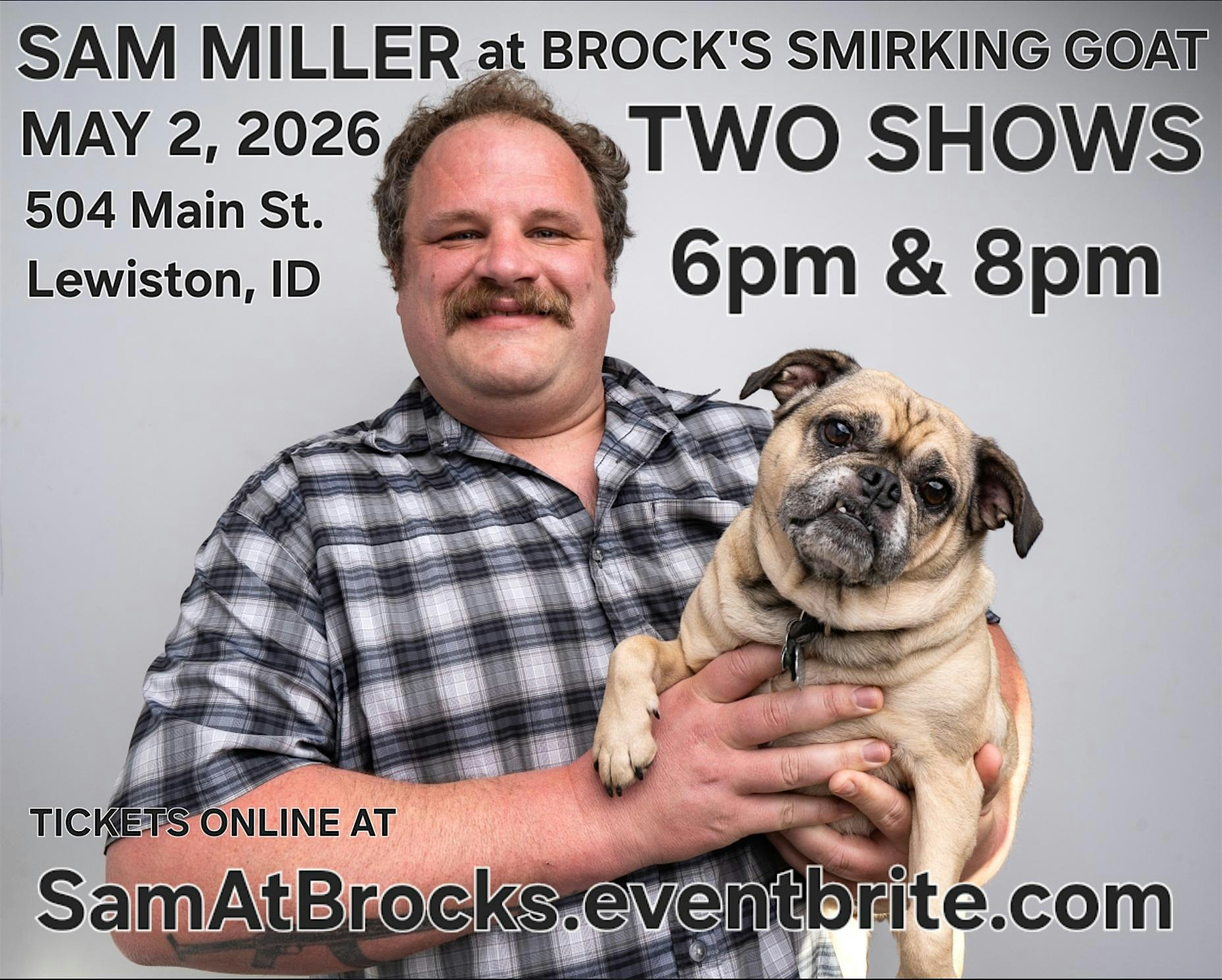 Sam Miller comedy at Brock’s Smirking Goat at Brocks – Lewiston, ID Sam Miller comedy at Brock’s Smirking Goat at Brocks – Lewiston, ID 4 4 people viewed this event. National touring comedian Sam Miller will be at Brock’s Smirking Goat in Lewiston, ID, for TWO SHOWS on May 2, along w/ two other comedians! Tickets-RSVP Link Register for event Date And Time Saturday, May 2nd, 2026 @ 06:00 PM Location 504 Main Street, Lewiston, ID 83501 Event Types ComedyConcert or PerformancePerforming & Visual Arts Event Category Idaho Share With Friends Facebook Twitter Linkedin Xing Pinterest