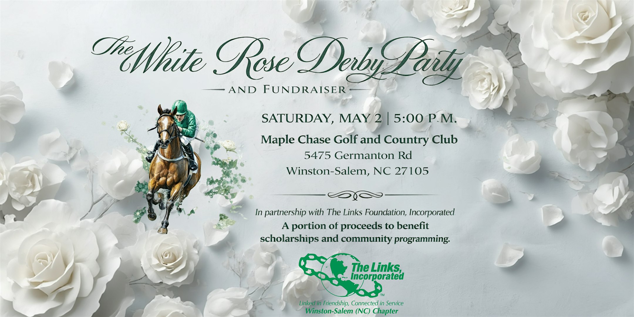 The Winston-Salem Chapter of The Links, Incorporated—one of the nation’s premier volunteer service organizations of professional women—invites you to join us for our signature White Rose Derby Party and Fundraiser on Saturday, May 2, 2026, from 5:00 p.m. to 10:00 p.m. at Maple Chase Golf & Country Club.