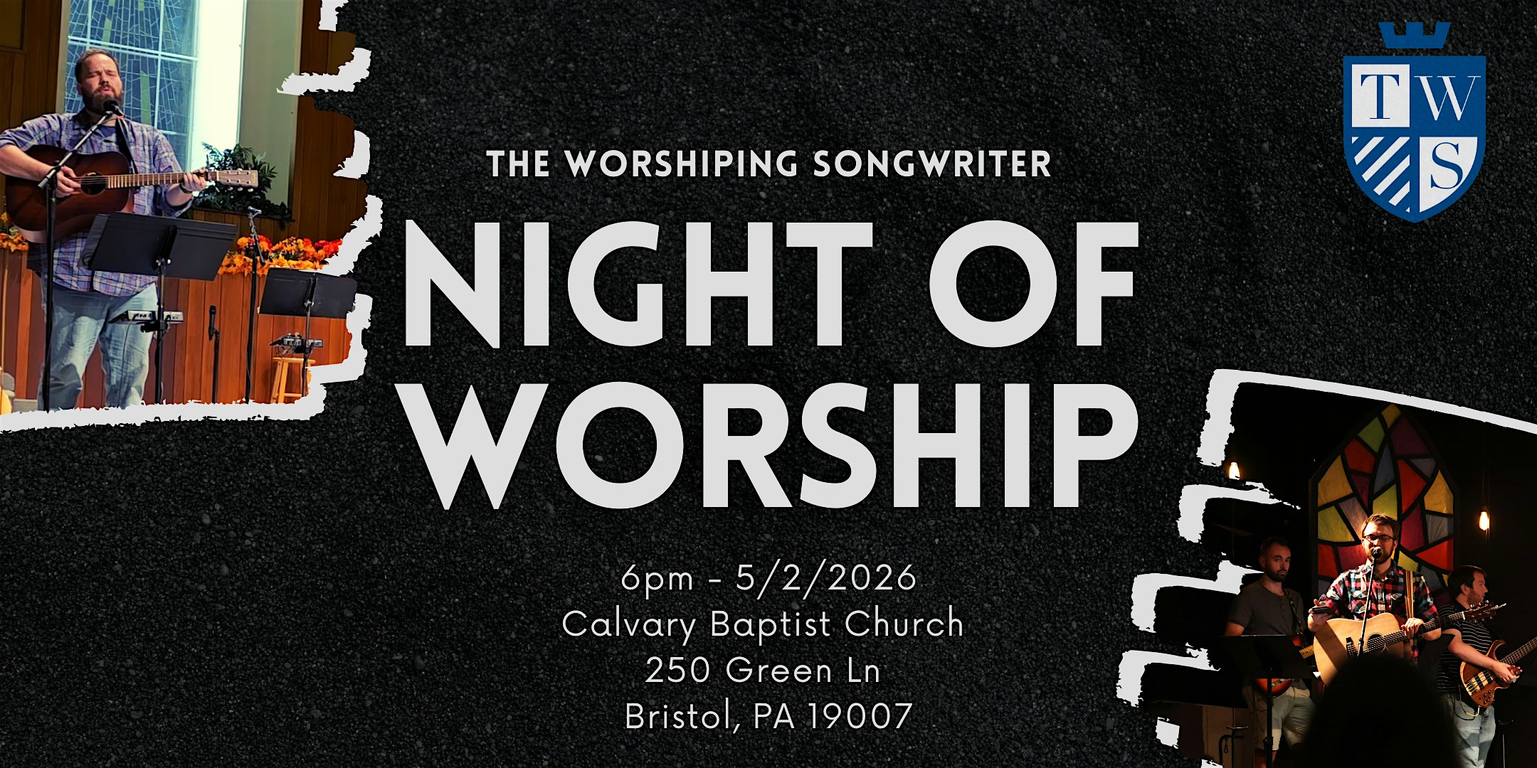 by admin22Feb TWS Night of Worship at Calvary Baptist Church – Bristol, PA TWS Night of Worship at Calvary Baptist Church – Bristol, PA 3 3 people viewed this event. Sing along with local songwriters as they share their new, original, worship songs. Tickets-RSVP Link Date And Time Saturday, May 2nd, 2026 @ 10:00 PM Location 250 Green Lane, Bristol, PA 19007 Event Types Concert or Performance Event Category Pennsylvania Share With Friends Facebook Twitter Linkedin Xing Pinterest Share This Post: