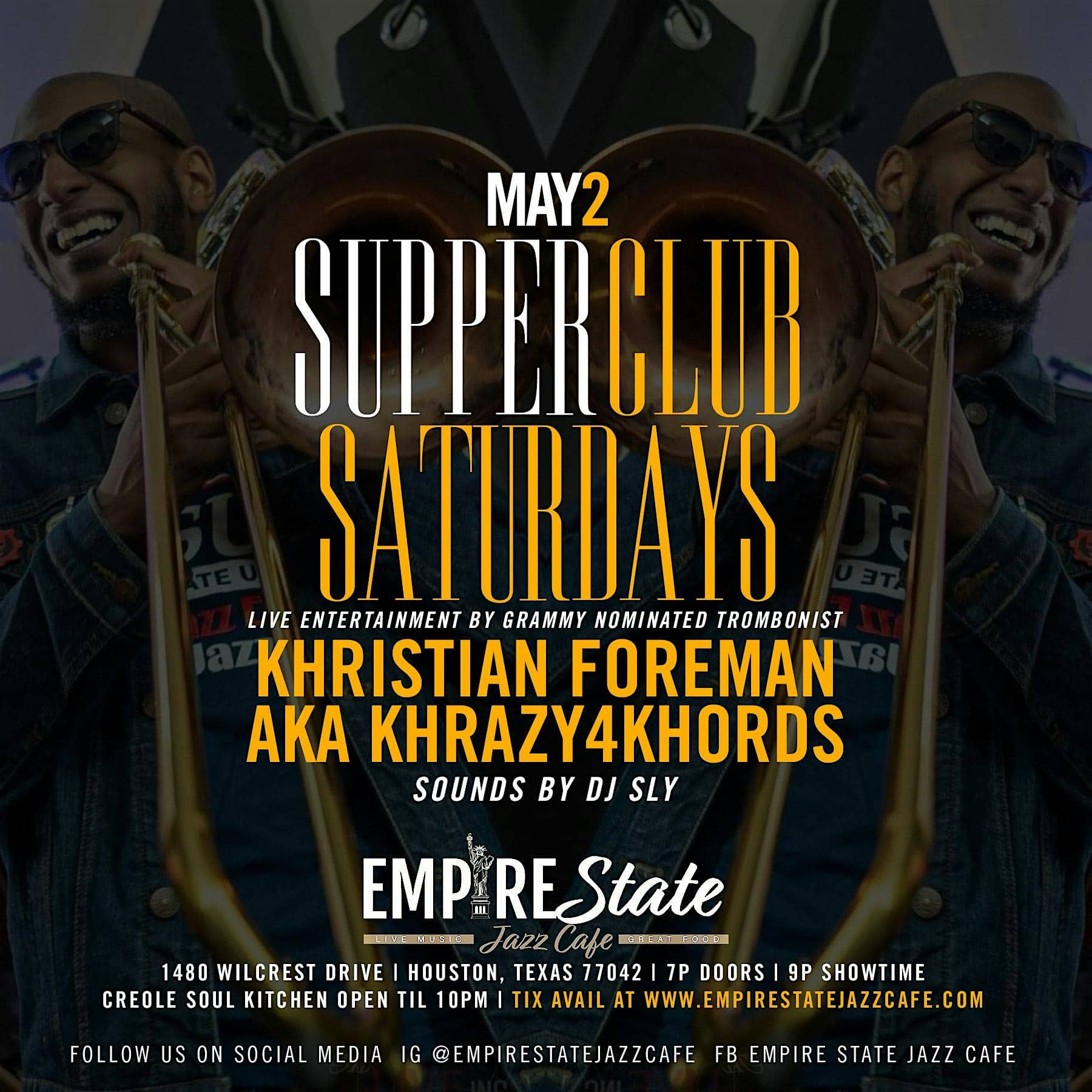 by admin14Feb 5/2- Grammy Nominated Trombonist Khristian Foreman at Empire State Jazz Cafe – Houston, TX 5/2- Grammy Nominated Trombonist Khristian Foreman at Empire State Jazz Cafe – Houston, TX 1 1 people viewed this event. Get ready to unwind and vibe to the smooth sounds of Khristian Foreman at SupperClub Saturday, where the music will lift your spirits high! Tickets-RSVP Link Date And Time Sunday, May 3rd, 2026 12:00 AM (PST) Venue Empire State Jazz Cafe Location 1480 Wilcrest Drive, Houston, TX 77042 Event Types Concert or PerformanceMusic Event Category HoustonTexas Share With Friends Facebook Twitter Linkedin Xing Pinterest Share This Post: