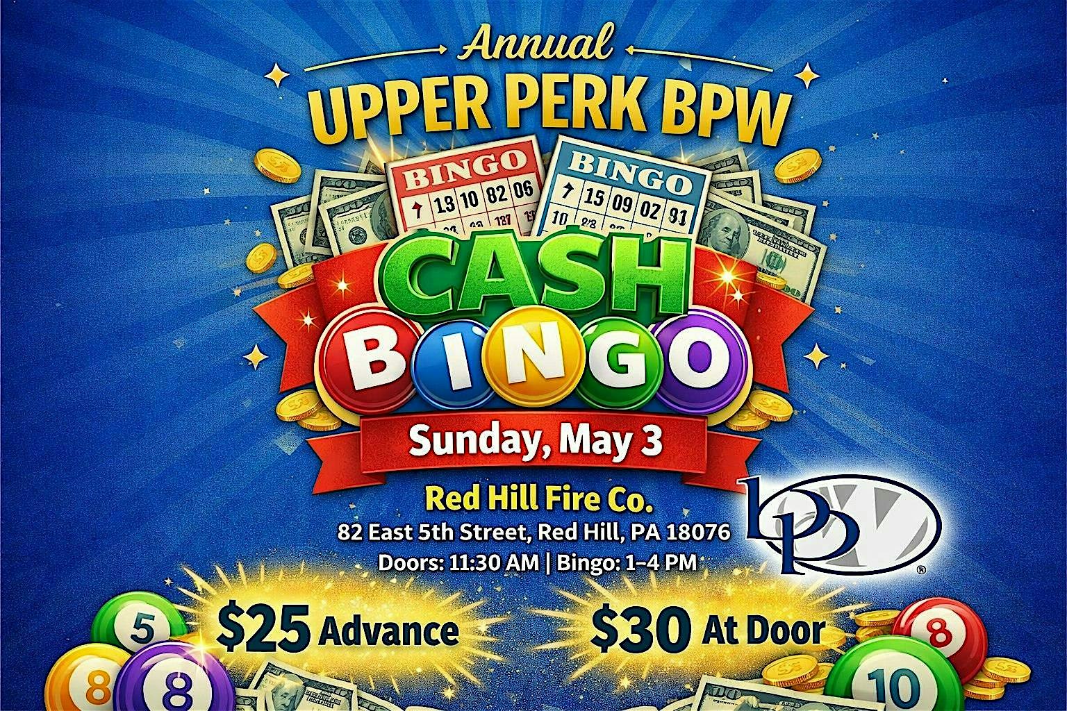 by admin13Feb Annual Upper Perk BPW Cash Bingo at Red Hill Firehouse Social Club – Red Hill, PA Annual Upper Perk BPW Cash Bingo at Red Hill Firehouse Social Club – Red Hill, PA 1 1 people viewed this event. Gather your friends, bring your lucky charm, and get ready for an exciting day of cash prizes, laughter, and supporting the Upper Perk BPW! Tickets-RSVP Link Date And Time Sunday, May 3rd, 2026 05:00 PM (PST) Venue Red Hill Firehouse Social Club Location 82 East 5th Street, Red Hill, PA 18076 Event Types Charity & CausesParty or Social Gathering Event Category Pennsylvania Share With Friends Facebook Twitter Linkedin Xing Pinterest Share This Post:
