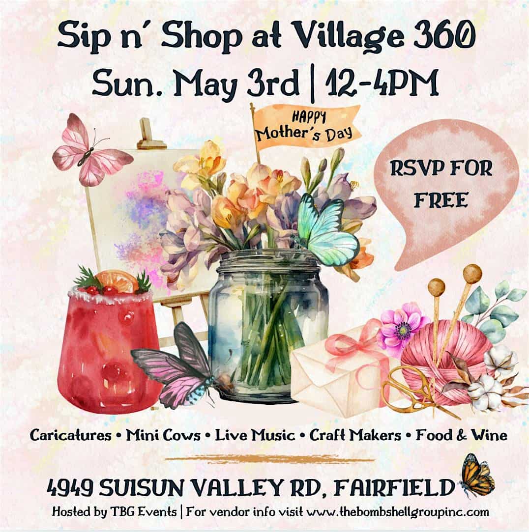 by admin14Feb Sip n’ Shop Mother’s Day Market at Village 360 – Fairfield, CA Sip n’ Shop Mother’s Day Market at Village 360 – Fairfield, CA 1 1 people viewed this event. Celebrate Mother’s Day with tasty sips and unique shopping at Village 360 Winery’s Sip n’ Shop Market! Tickets-RSVP Link Date And Time Sunday, May 3rd, 2026 07:00 PM (PST) Venue Village 360 Location 4949 Suisun Valley Road, Fairfield, CA 94534 Event Types Festival or FairFood & Drink Event Category California Share With Friends Facebook Twitter Linkedin Xing Pinterest Share This Post: