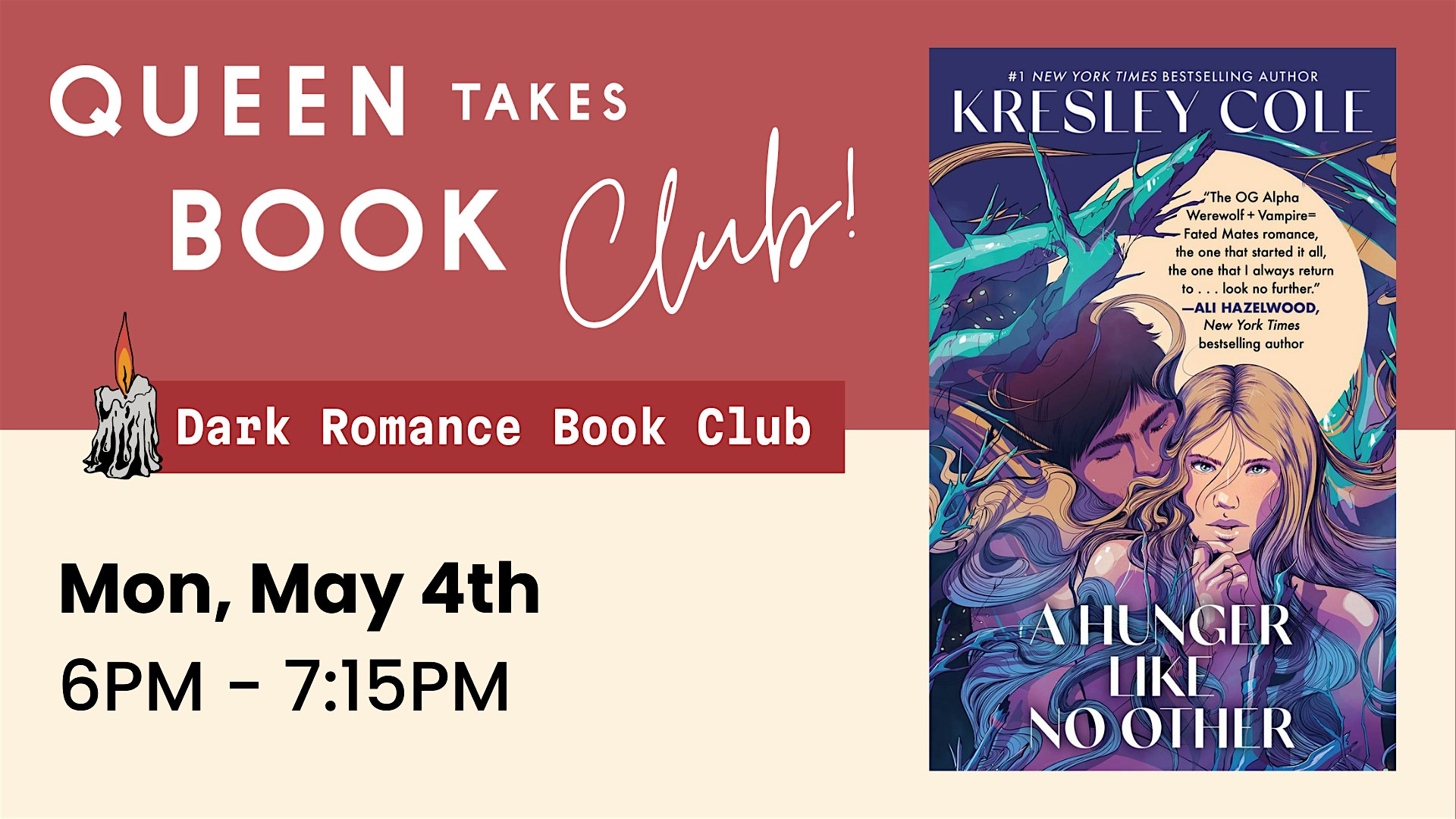 Join us for our Dark Romance Book Club on Monday, May 4th at 6pm. We’re reading “A Hunger Like No Other” by Kresley Cole.
