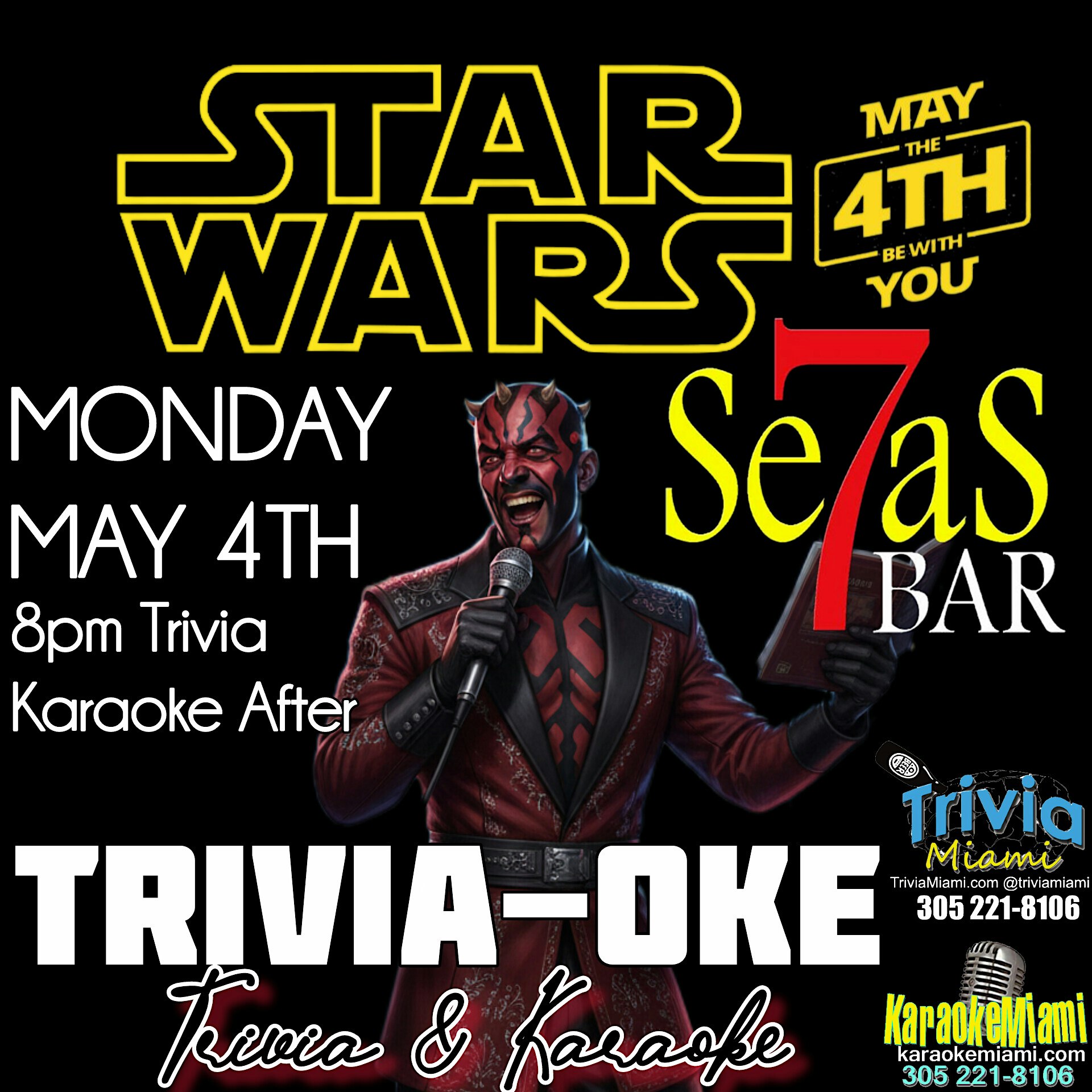 Star Wars Trivia-Oke at Se7aS Bar – Miami, FL Star Wars Trivia-Oke at Se7aS Bar – Miami, FL 6 6 people viewed this event. Celebrate Star Wars Day with Trivia & Karaoke Tickets-RSVP Link Register for event Date And Time Monday, May 4th, 2026 @ 08:00 PM Location 2200 Southwest 57th Avenue, Miami, FL 33155 Event Types Party or Social GatheringSeasonal & Holiday Event Category FloridaMiami Share With Friends Facebook Twitter Linkedin Xing Pinterest